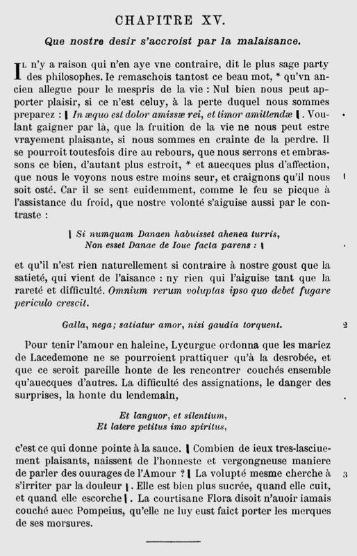 12, Carentem.—Horace, Od., I, 31, 17.—Il est impossible de n’être pas frappé de l’espèce de contradiction que présentent la fin tant soit peu épicurienne (dans le bon sens du mot) des Essais et la mort si dévotieuse de leur auteur (V. supra, fasc. A, p. XI).—On peut dire que le souhait emprunté à Horace par lequel Montaigne termine son livre, est le dernier soupir du lettré; c’est le reflet mourant de l’enthousiasme de l’antiquité, c’est la fin de la vie écrite. Dans la vie vécue, au contraire, le Montaigne de l’apologie de Sebond reparaît, et, au point de vue religieux, il est peu de morts plus démonstratives que celle-là. Dr Payen.—Fidèle à ses principes, il finit comme Socrate «en se conformant aux façons et formes reçues autour de lui»; sa dernière pensée fut un dernier hommage à la religion de ses pères. Abbé Jay.—Et de fait, à tous points de vue, on peut dans l’ensemble lui faire application de ce vers de La Fontaine: