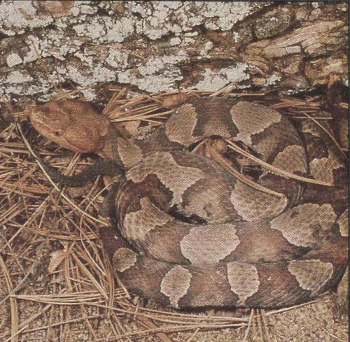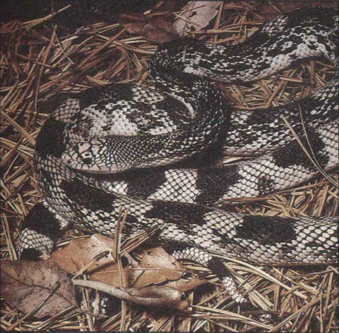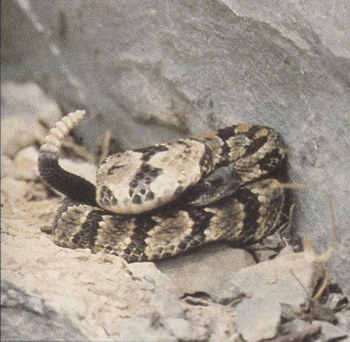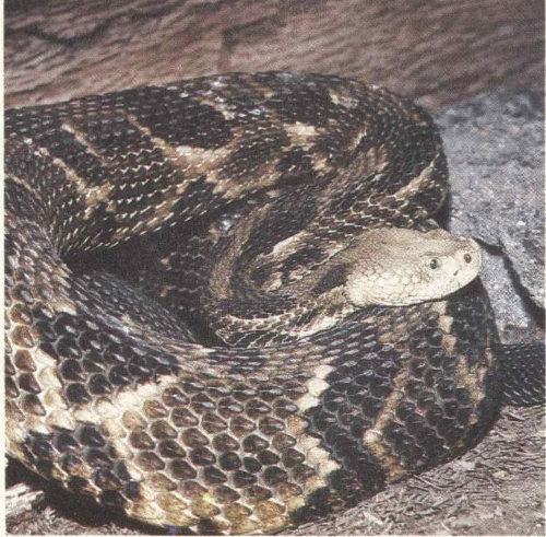 The timber rattlesnake (above) and the copperhead are the only poisonous snakes in these mountains.