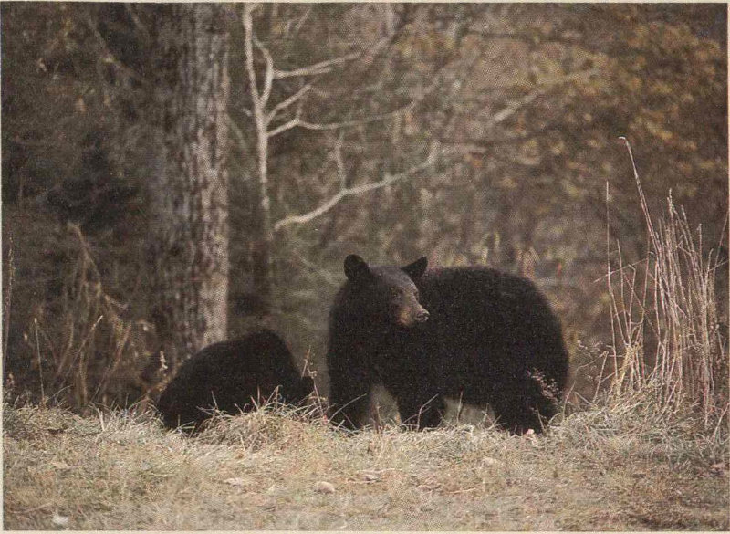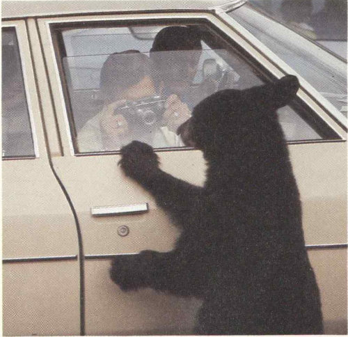 The black bear is the largest wild animal in these parts. It can weigh 225 kilograms (500 pounds) or more, but is capable of incredibly fast sprints on rough terrain. It is a wild animal, and protected as such it sometimes loses its normal fear of people. This makes the bear appear tame, but it is then actually more dangerous than its truly wild counterparts. If you come upon a bear while you are in your car, keep the windows shut. Do not attempt to feed, tease, molest, or get close to a bear. Do not try to take a closeup portrait photograph of a bear; either use a telephoto lens or be satisfied with a distant shot.