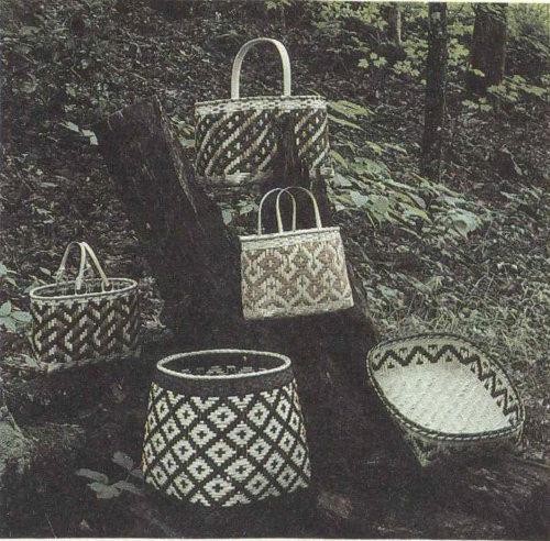 Three main types of basketry are made by Cherokees. Rivercane baskets are now relatively scarce because the once-abundant cane is itself scarce now. White oak baskets are more common. Baskets are also woven from honeysuckle. Above are exquisite examples of basketry by Carol S. Welch, a member of the Eastern Band of Cherokee Indians.