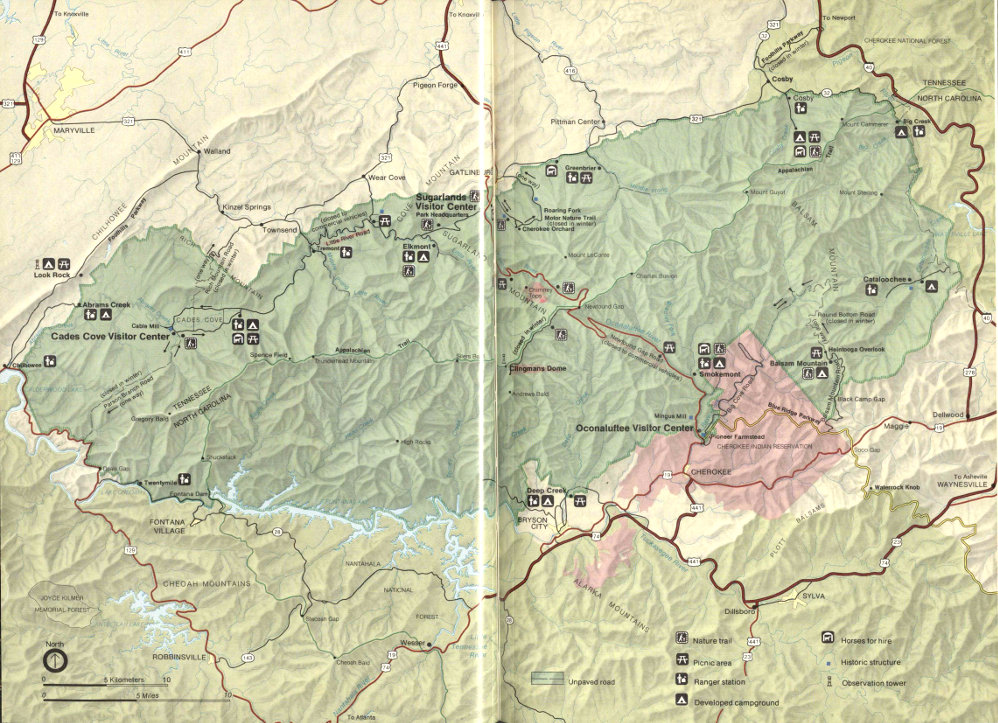 The Great Smoky Mountains and their national park are both rich in lore, much of which has been collected and committed to print over the years. Your appreciation of a trip to these mountains can be greatly enhanced, both before and after, by reading accounts of the area’s history, natural history, and folklore. There are also field identification guides to nearly everything you see here, from rocks and flowers to spiders and mammals. And there are trail and hiking guidebooks full of good tips and advice on interesting trips, both day trips and overnights. Listed here are selected titles usually available for purchase at park visitor centers, or to be found in your public library. Many of these may also be purchased in bookstores in communities near the park. Several interesting and useful maps of the area are also available. For a more complete list of publications write to the Great Smoky Mountains Natural History Association, Gatlinburg, Tennessee 37738. This nonprofit association maintains a sales list of technical and other books about the Smokies as part of its efforts to enhance the interpretation of the park’s values to the public.