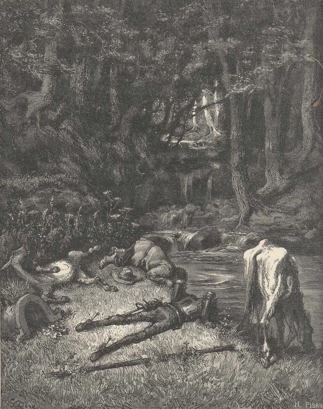 The sage Cide Hamete Benengeli relates that as soon as Don Quixote took leave of his hosts and all who had been present at the burial of Chrysostom, he and his squire passed into the same wood which they had seen the shepherdess Marcela enter, and after having wandered for more than two hours in all directions in search of her without finding her, they came to a halt in a glade covered with tender grass, beside which ran a pleasant cool stream that invited and compelled them to pass there the hours of the noontide heat, which by this time was beginning to come on oppressively. Don Quixote and Sancho dismounted, and turning Rocinante and the ass loose to feed on the grass that was there in abundance, they ransacked the alforjas, and without any ceremony very peacefully and sociably master and man made their repast on what they found in them.