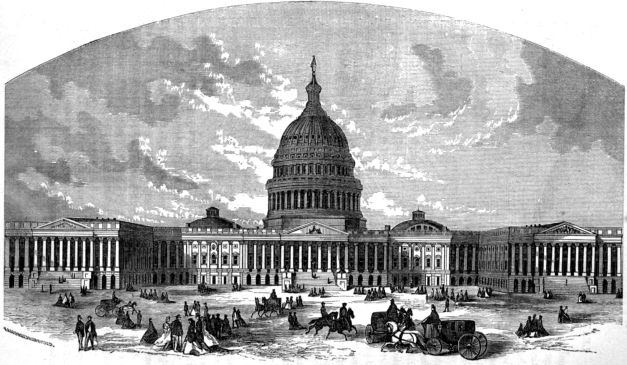 After passing the catafalque, most of the visitors left the building by the west staircase and departed; but many mounted to the dome and viewed the crowds assembled at the east front from that point of vantage. All day the streets were thronged with people. The street-cars, which had been appropriately draped, were filled to overflowing both to and from the Capitol, and all the conveyances in the city were brought into requisition. The trains brought many visitors from all parts of the nation to the city; and many country people from Maryland and Virginia took advantage of the pageant to visit the city.