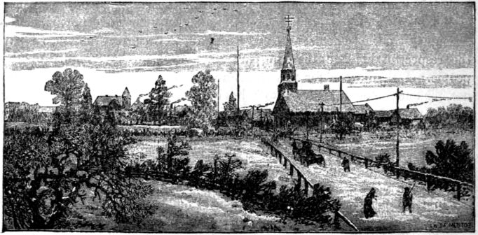 Stepping out of doors, one would see that the cabin stood on the edge of a small clearing of some twenty acres. On the south, at a little distance, stood a solid log barn, differing from the house only in having open cracks. The barn-yard had a worm fence around it, and contained a heavy ox-wagon and a feeding-trough for hogs. Skirting the clearing on all sides was the forest primeval, which, on the 19th of November, the frost had already transfigured with gold and scarlet splendors. Cold winds whistled through the branches, and thick showers of dry leaves fell rustling to the ground.