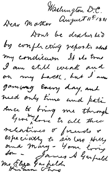 For awhile the dreadful intelligence was held back from the faithful heart that had sheltered James A. Garfield in his childhood. At length, after breakfast, she sought, as usual, the daily telegram from her son. Finding the dispatch, she was about to read, when her granddaughter took the message from her trembling hands.