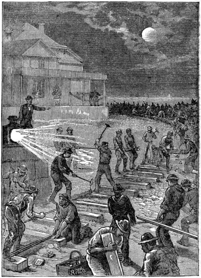 653Promptly at 10 o’clock the train moved slowly away toward the Elberon station. At this time there were two or three thousand persons lining the track, and the roadway was crowded with carriages for half a mile. Men stood with uncovered heads watching the train as it disappeared from view.