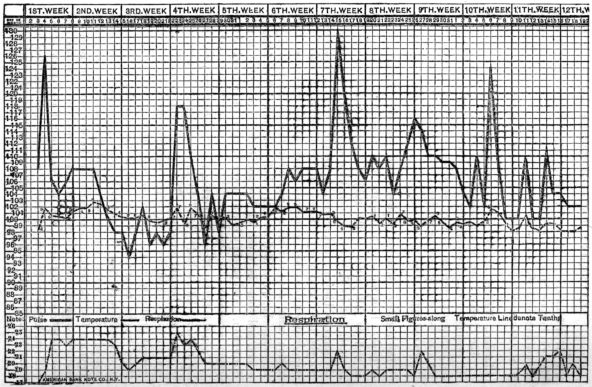 “On an examination of the organs of the chest, evidences of severe bronchitis were found on both sides, with broncho-pneumonia of the lower portion of the right lung, and, though to a much less extent, of the left. The lungs contained no abscesses, and the heart no clots. The liver was enlarged and fatty, but not from abscesses. Nor were any found in any other organ except the left kidney, which contained near its surface a small abscess about one-third of an inch in diameter.