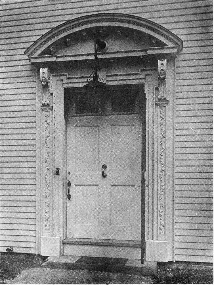 The doorway of the early Dutch houses was not a feature of any architectural pretension. It was approached by one or two steps only, as the houses were close to the ground, and sometimes a small platform, or a stoop with settles on either side, gave an inviting appearance indicative of the hospitality within. The doorway was rectangular without attempt at adornment further than occasionally a narrow transom with small, square lights. Even this was often lacking. The Dutch door divided in the middle shared the honours with solid, undivided batten doors. Both types were in common use, although preference was given the Dutch or divided door for the main entrance{31} and the corresponding back entrance at the opposite end of the hall.