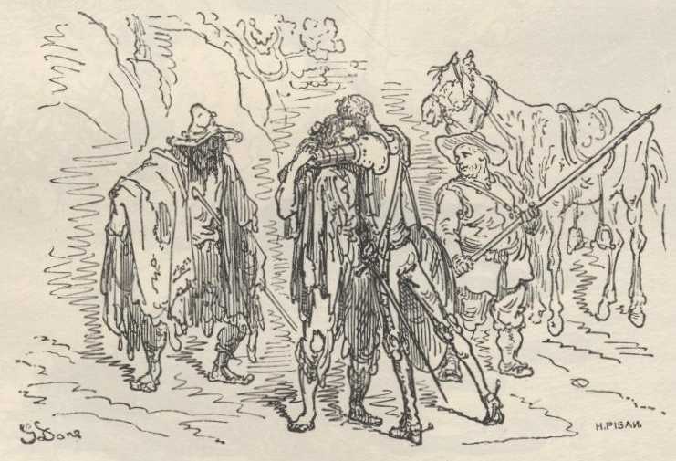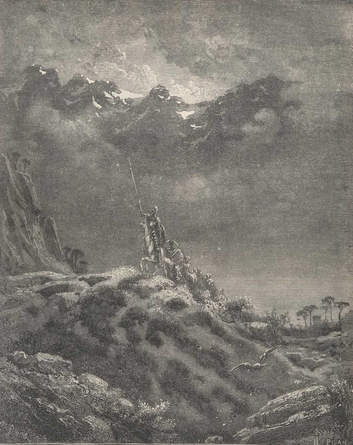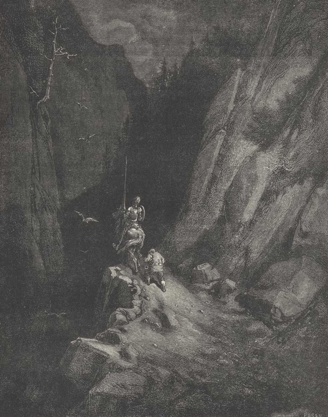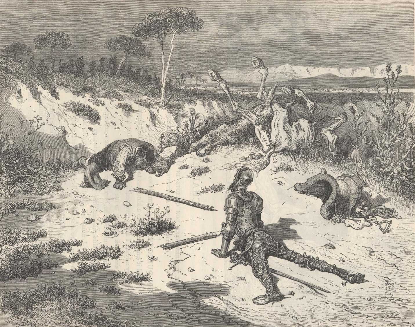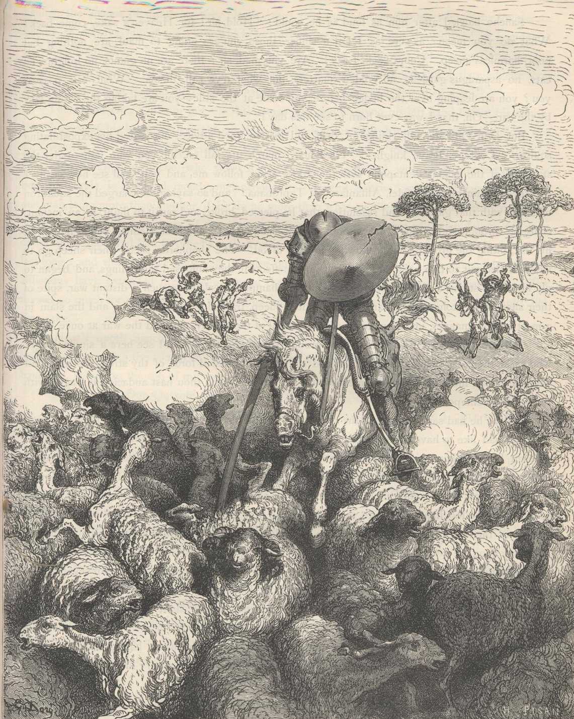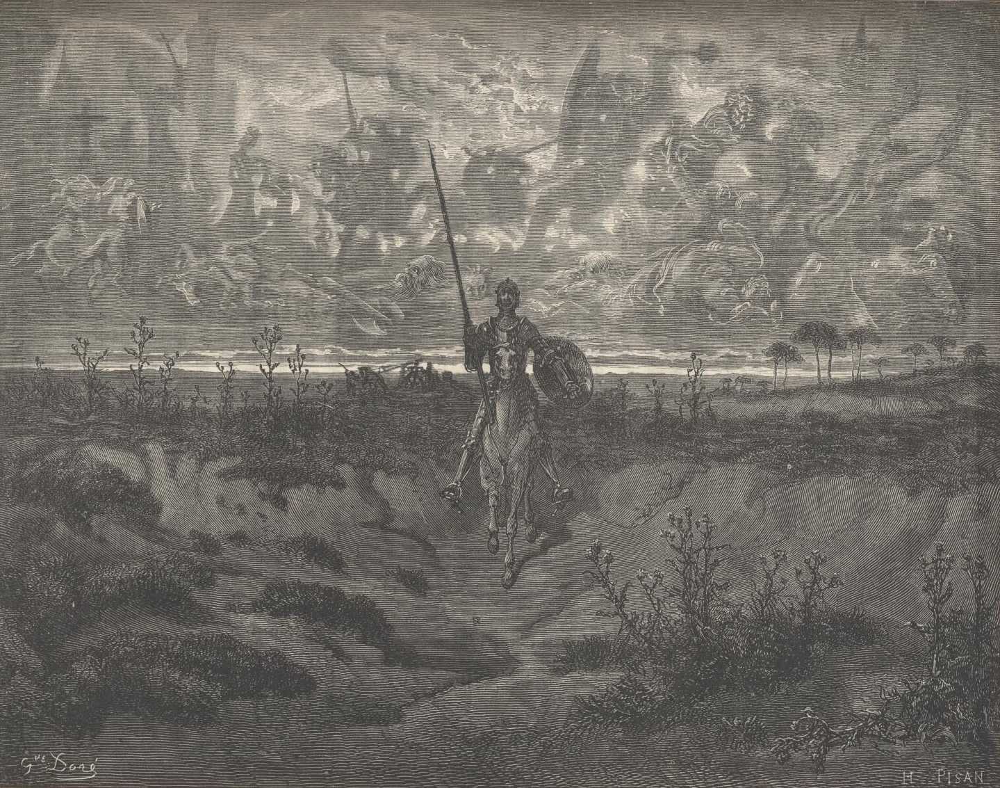 The book cover and spine above and the images which follow were not part of the original Ormsby translation—they are taken from the 1880 edition of J. W. Clark, illustrated by Gustave Dore. Clark in his edition states that, “The English text of ‘Don Quixote’ adopted in this edition is that of Jarvis, with occasional corrections from Motteaux.” See in the introduction below John Ormsby’s critique of both the Jarvis and Motteaux translations. It has been elected in the present Project Gutenberg edition to attach the famous engravings of Gustave Dore to the Ormsby translation instead of the Jarvis/Motteaux. The detail of many of the Dore engravings can be fully appreciated only by utilizing the “Full Size” button to expand them to their original dimensions. Ormsby in his Preface has criticized the fanciful nature of Dore’s illustrations; others feel these woodcuts and steel engravings well match Quixote’s dreams. D.W.
