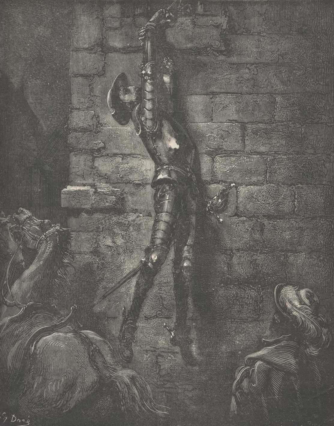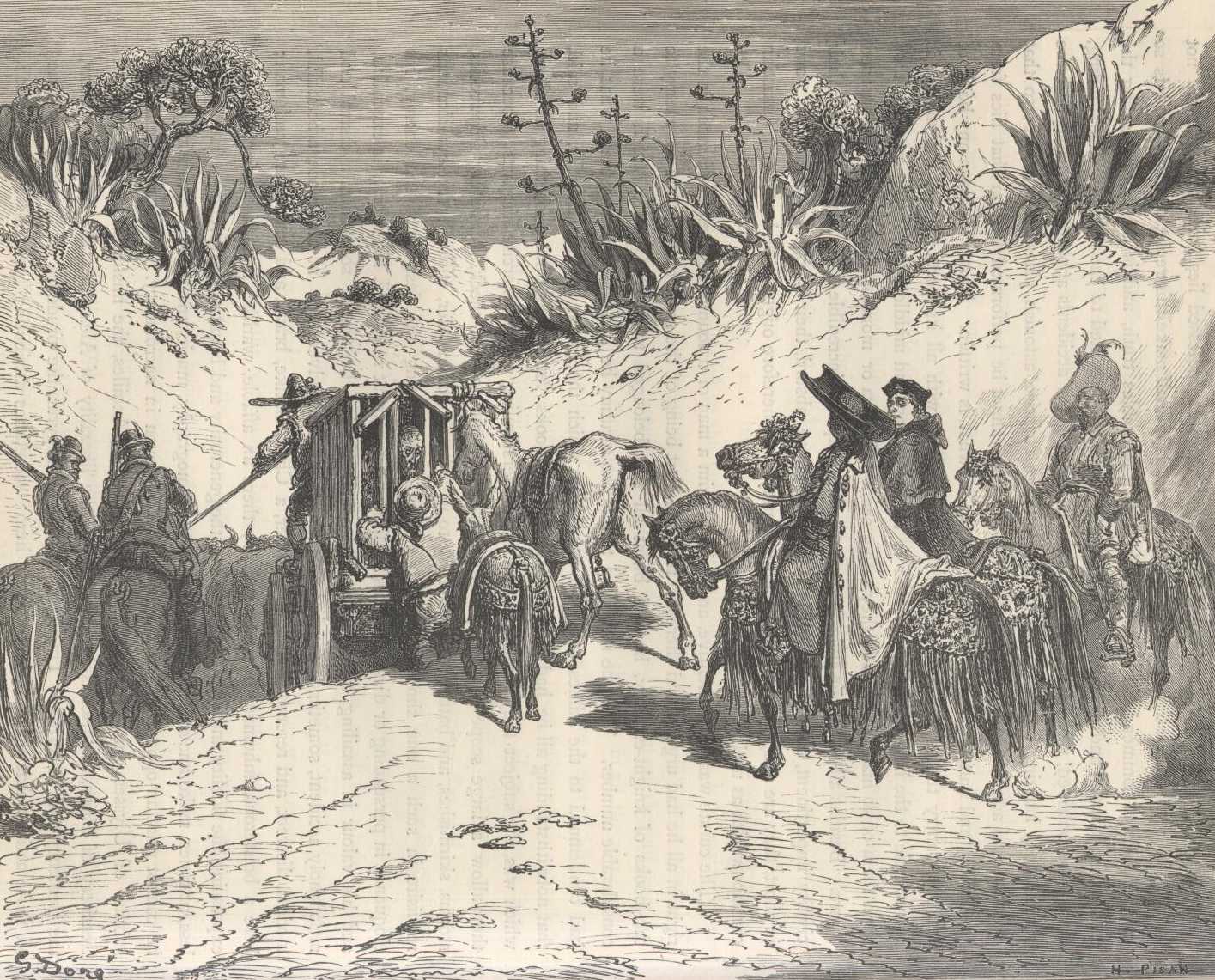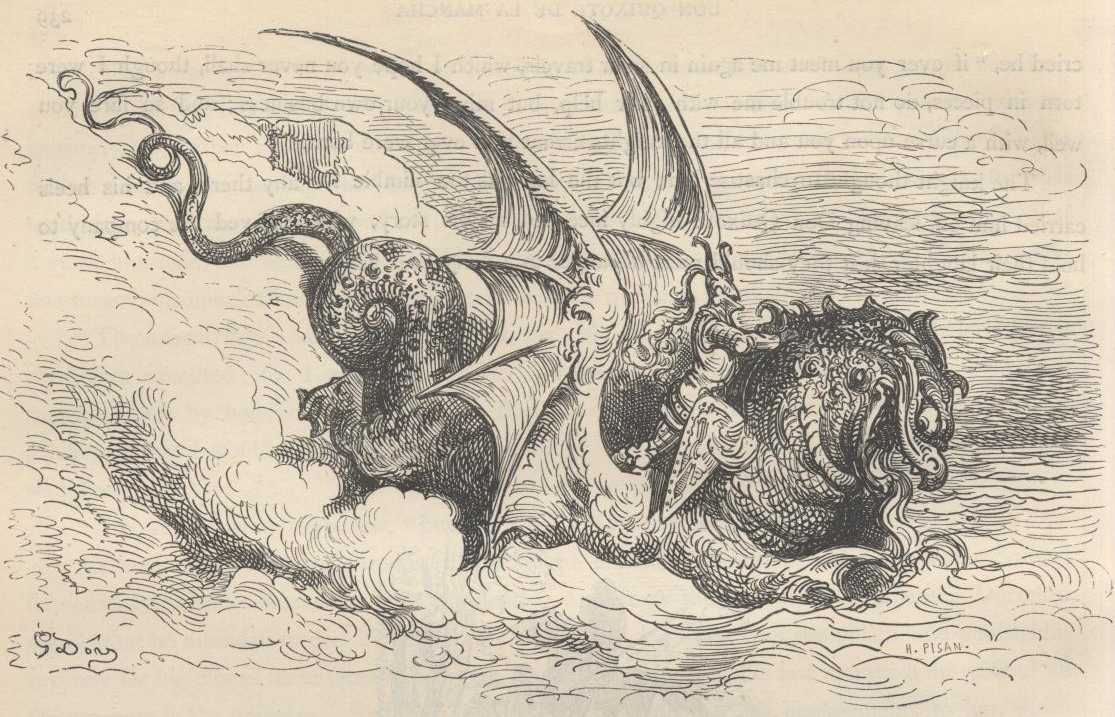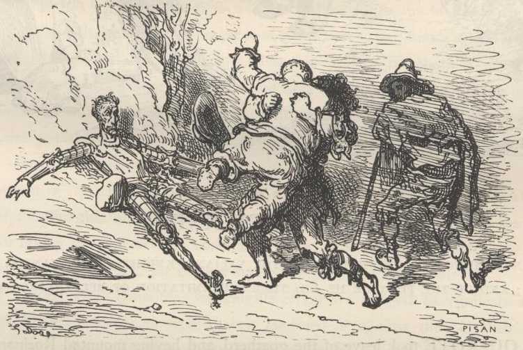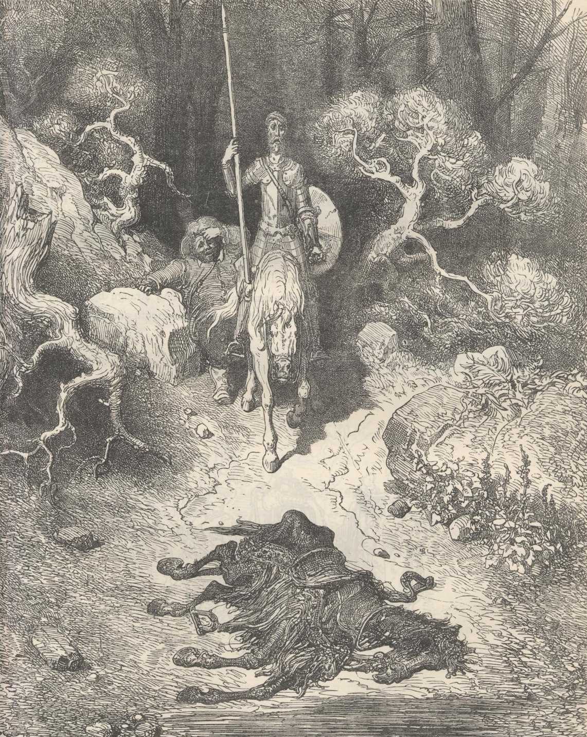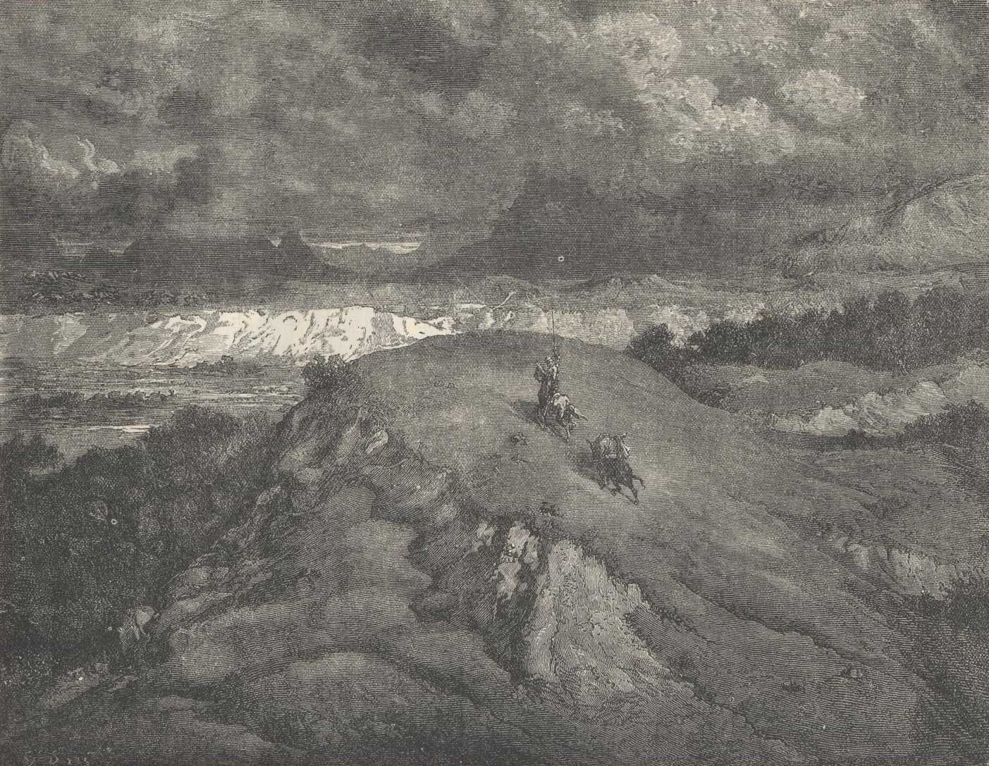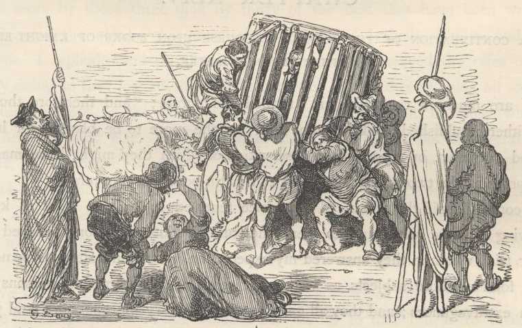 The book cover and spine above and the images which follow were not part of the original Ormsby translation—they are taken from the 1880 edition of J. W. Clark, illustrated by Gustave Dore. Clark in his edition states that, “The English text of ‘Don Quixote’ adopted in this edition is that of Jarvis, with occasional corrections from Motteaux.” See in the introduction below John Ormsby’s critique of both the Jarvis and Motteaux translations. It has been elected in the present Project Gutenberg edition to attach the famous engravings of Gustave Dore to the Ormsby translation instead of the Jarvis/Motteaux. The detail of many of the Dore engravings can be fully appreciated only by utilizing the “Full Size” button to expand them to their original dimensions. Ormsby in his Preface has criticized the fanciful nature of Dore’s illustrations; others feel these woodcuts and steel engravings well match Quixote’s dreams. D.W.