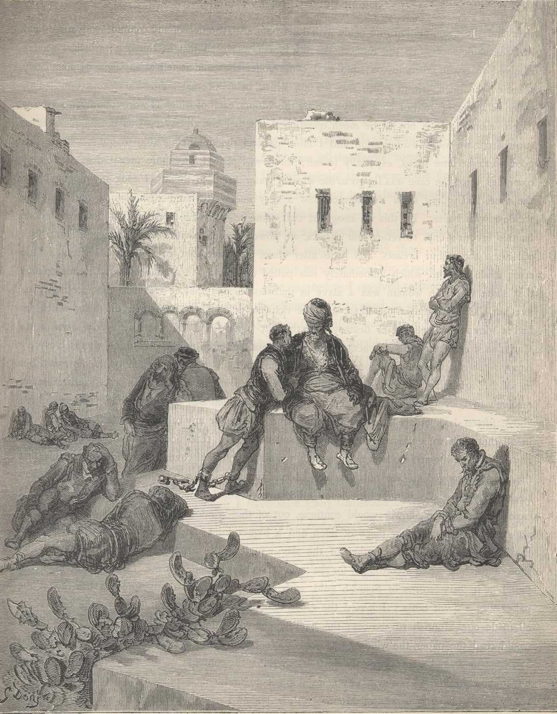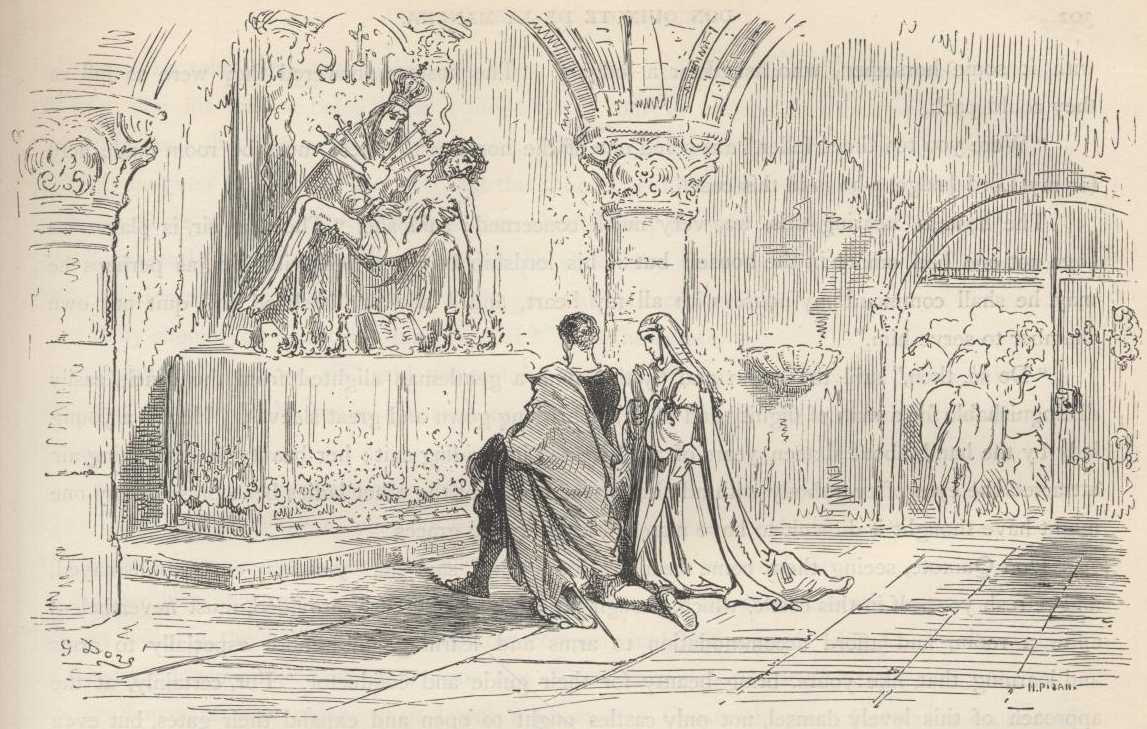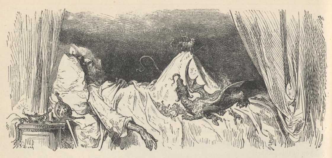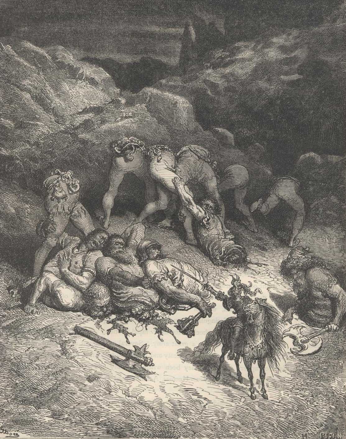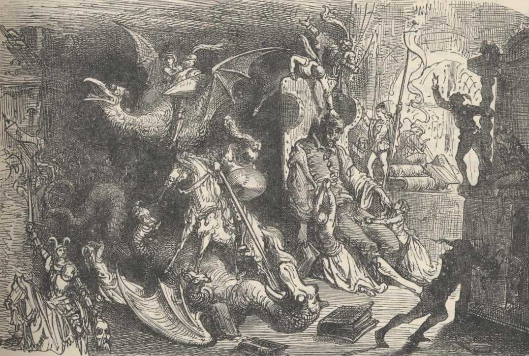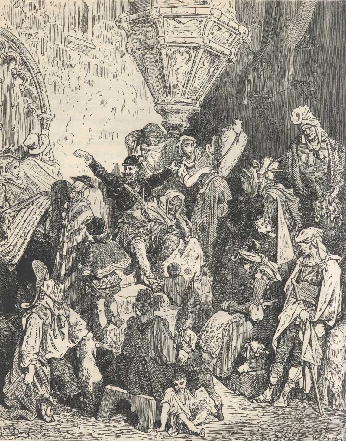 The book cover and spine above and the images which follow were not part of the original Ormsby translation—they are taken from the 1880 edition of J. W. Clark, illustrated by Gustave Dore. Clark in his edition states that, “The English text of ‘Don Quixote’ adopted in this edition is that of Jarvis, with occasional corrections from Motteaux.” See in the introduction below John Ormsby’s critique of both the Jarvis and Motteaux translations. It has been elected in the present Project Gutenberg edition to attach the famous engravings of Gustave Dore to the Ormsby translation instead of the Jarvis/Motteaux. The detail of many of the Dore engravings can be fully appreciated only by utilizing the “Full Size” button to expand them to their original dimensions. Ormsby in his Preface has criticized the fanciful nature of Dore’s illustrations; others feel these woodcuts and steel engravings well match Quixote’s dreams. D.W.