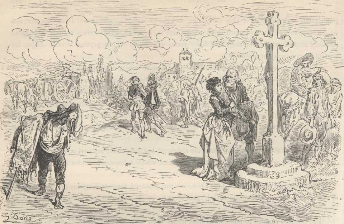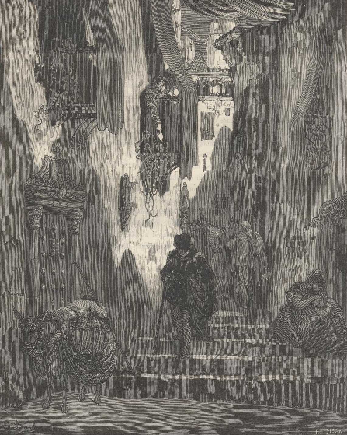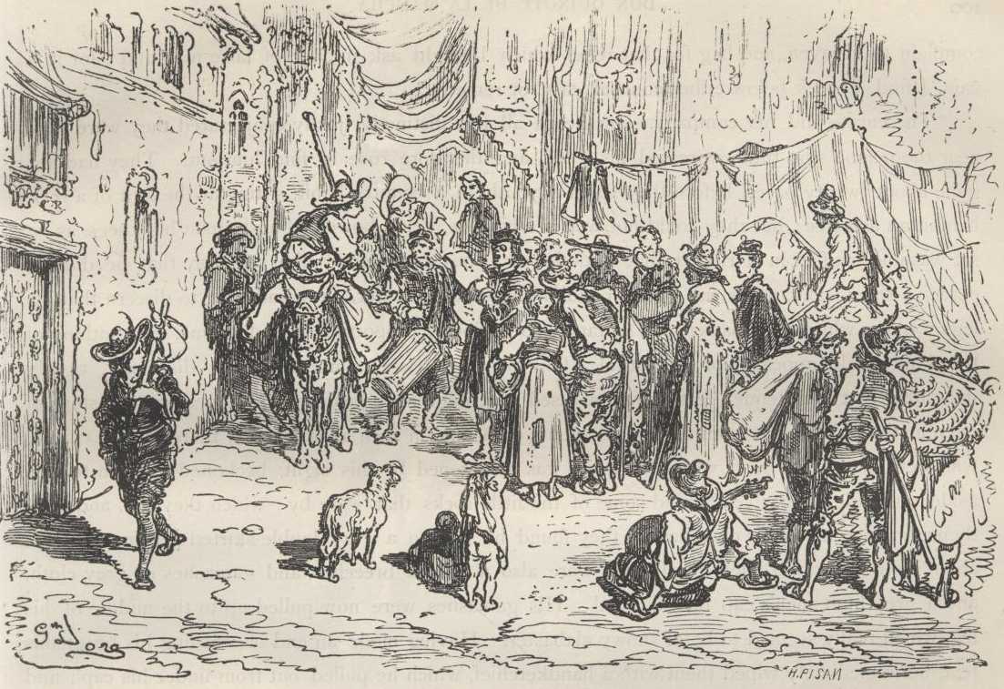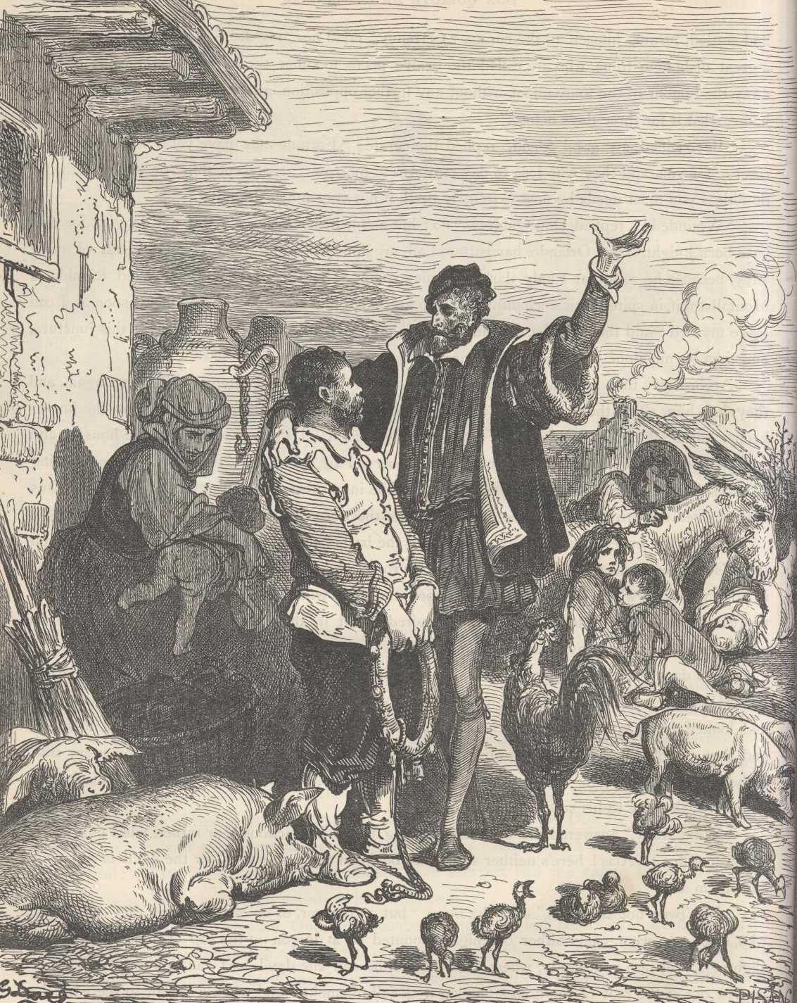 At the news of Don Quixote’s arrival Sancho Panza’s wife came running, for she by this time knew that her husband had gone away with him as his squire, and on seeing Sancho, the first thing she asked him was if the ass was well. Sancho replied that he was, better than his master was.