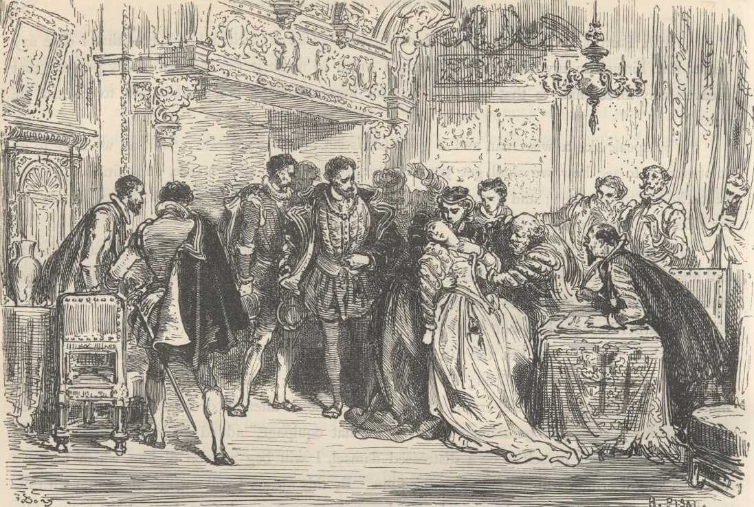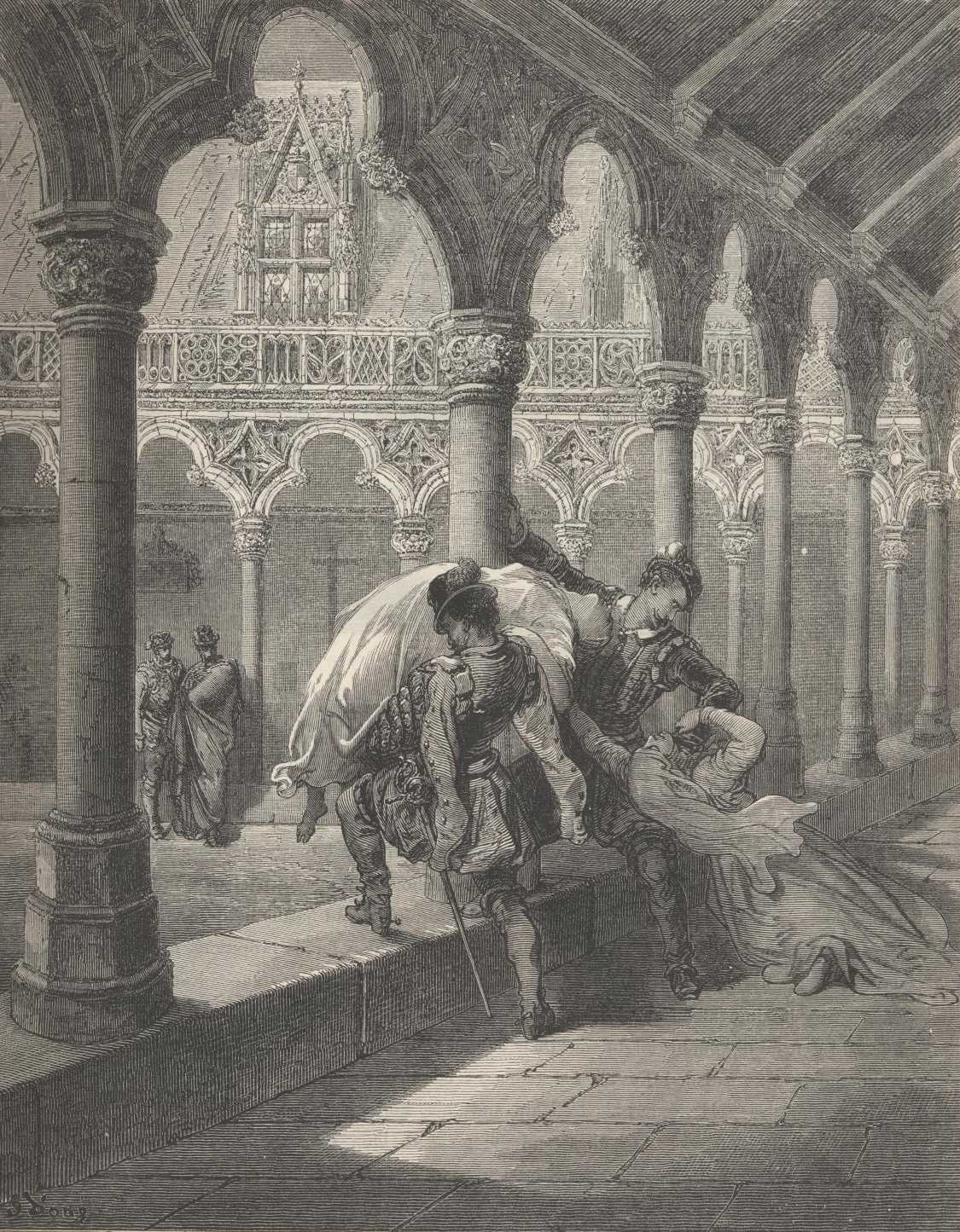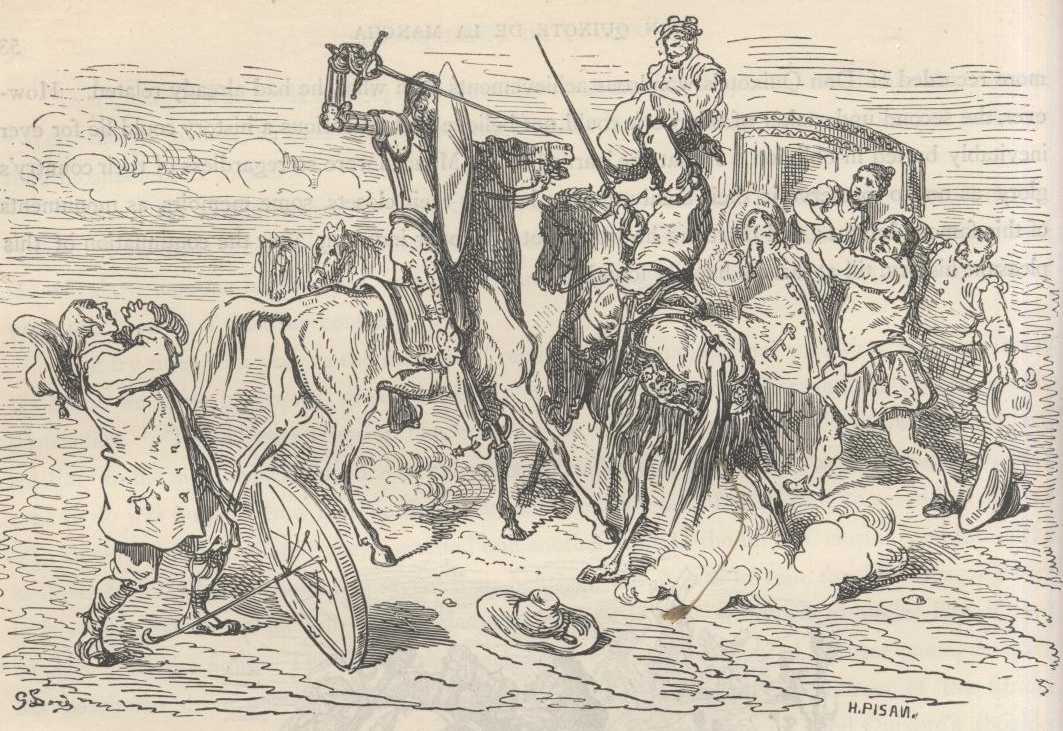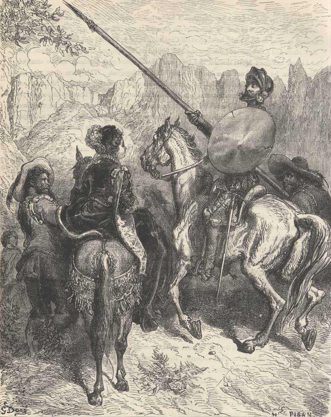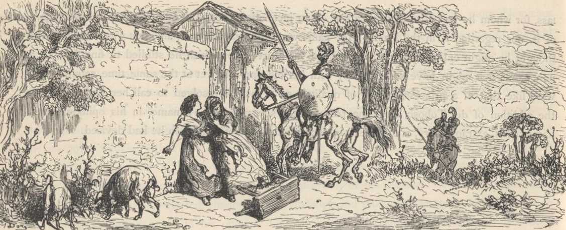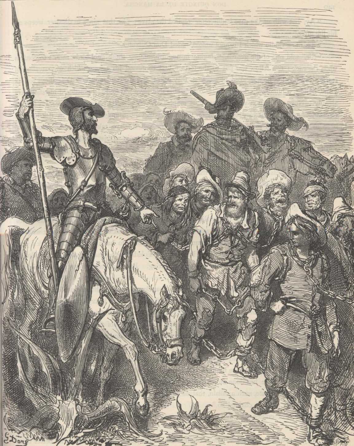 “I will say it in one,” replied Don Quixote, “and it is this; that at once, this very instant, ye release that fair lady whose tears and sad aspect show plainly that ye are carrying her off against her will, and that ye have committed some scandalous outrage against her; and I, who was born into the world to redress all such like wrongs, will not permit you to advance another step until you have restored to her the liberty she pines for and deserves.”