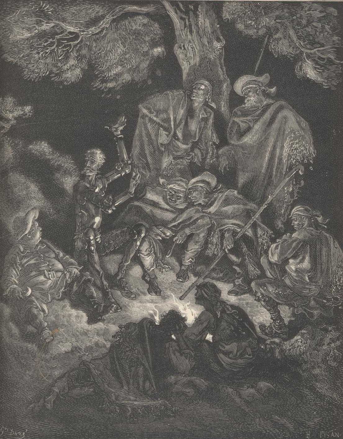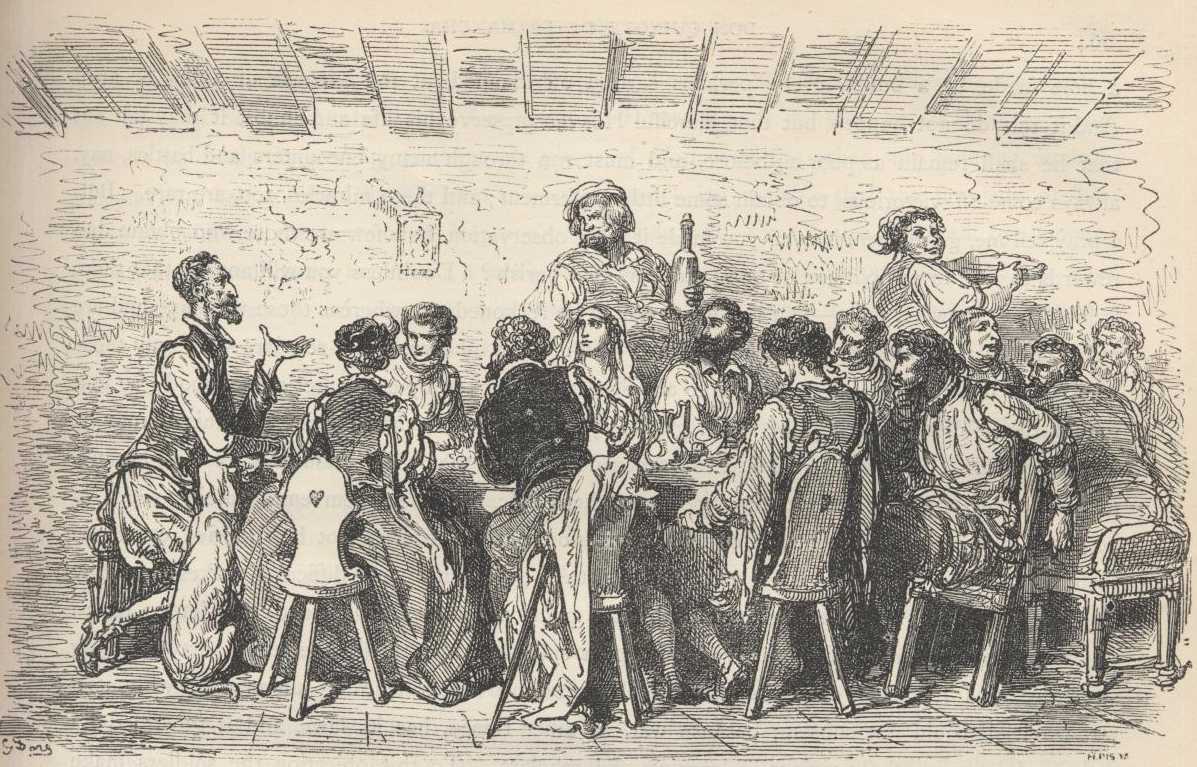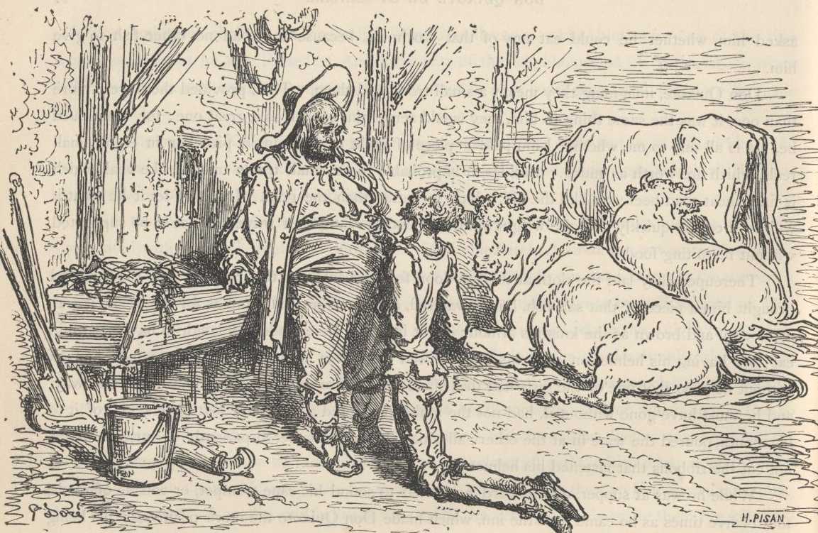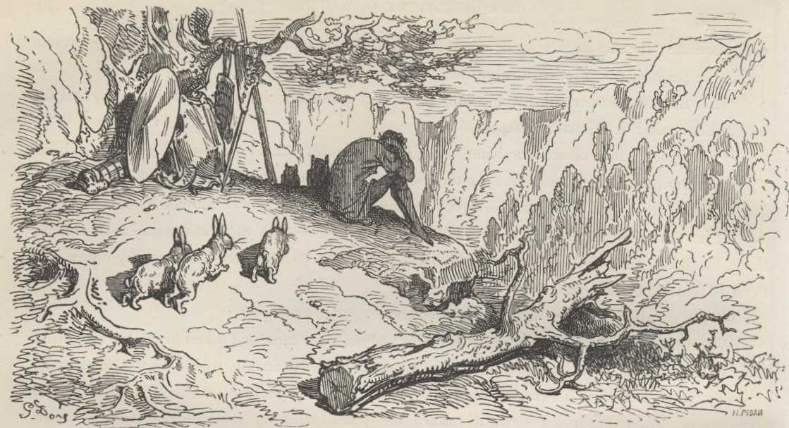 The goatherd’s talk amused all who heard it, but especially the canon, who said to him, “As you live, brother, take it easy, and be not in such a hurry to drive this goat back to the fold; for, being a female, as you say, she will follow her natural instinct in spite of all you can do to prevent it. Take this morsel and drink a sup, and that will soothe your irritation, and in the meantime the goat will rest herself,” and so saying, he handed him the loins of a cold rabbit on a fork.
