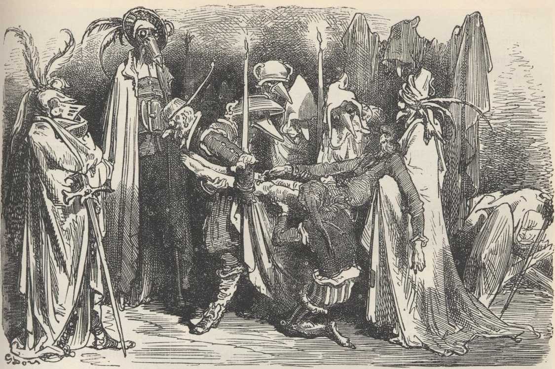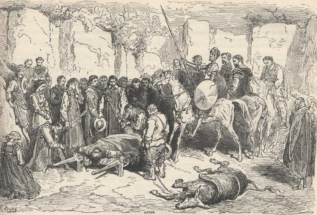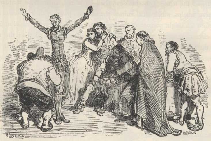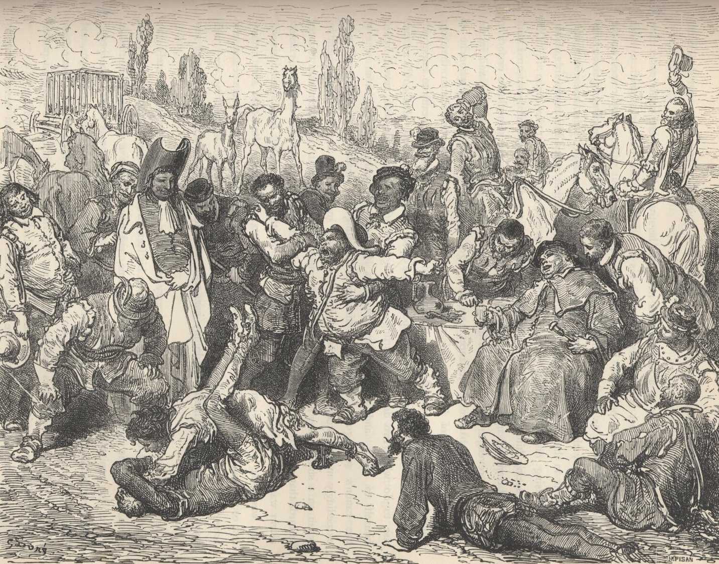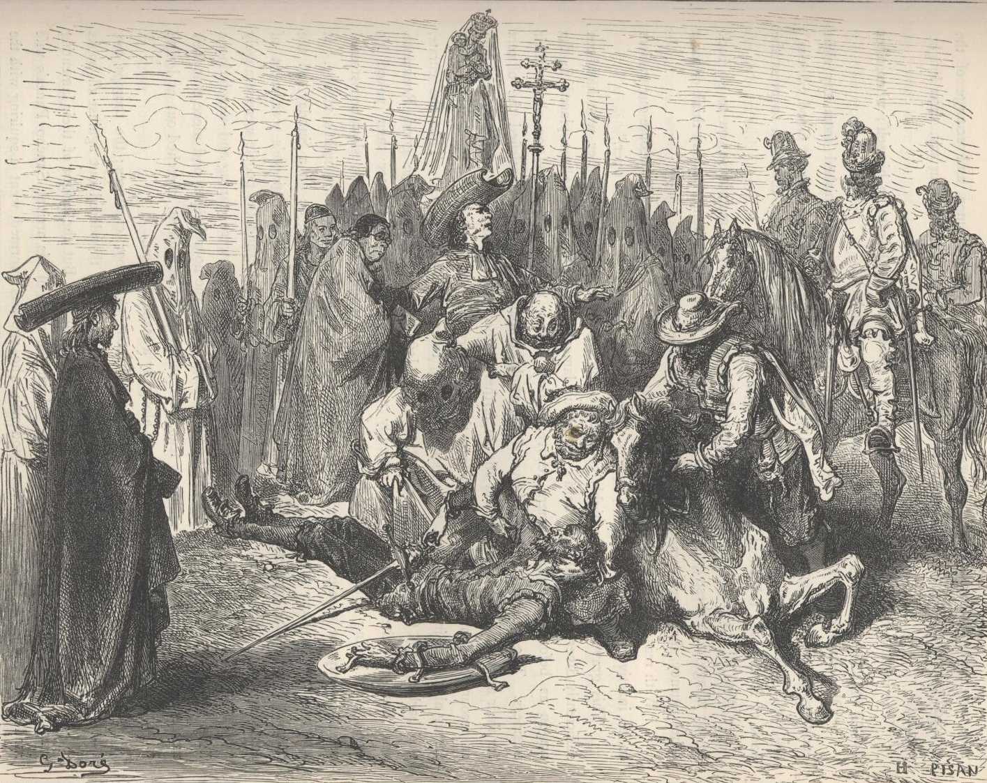 By this time all Don Quixote’s companions had come up to where he lay; but the processionists seeing them come running, and with them the officers of the Brotherhood with their crossbows, apprehended mischief, and clustering round the image, raised their hoods, and grasped their scourges, as the priests did their tapers, and awaited the attack, resolved to defend themselves and even to take the offensive against their assailants if they could. Fortune, however, arranged the matter better than they expected, for all Sancho did was to fling himself on his master’s body, raising over him the most doleful and laughable lamentation that ever was heard, for he believed he was dead. The curate was known to another curate who walked in the procession, and their recognition of one another set at rest the apprehensions of both parties; the first then told the other in two words who Don Quixote was, and he and the whole troop of penitents went to see if the poor gentleman was dead, and heard Sancho Panza saying, with tears in his eyes, “Oh flower of chivalry, that with one blow of a stick hast ended the course of thy well-spent life! Oh pride of thy race, honour and glory of all La Mancha, nay, of all the world, that for want of thee will be full of evil-doers, no longer in fear of punishment for their misdeeds! Oh thou, generous above all the Alexanders, since for only eight months of service thou hast given me the best island the sea girds or surrounds! Humble with the proud, haughty with the humble, encounterer of dangers, endurer of outrages, enamoured without reason, imitator of the good, scourge of the wicked, enemy of the mean, in short, knight-errant, which is all that can be said!”