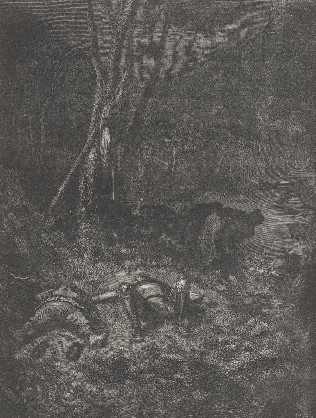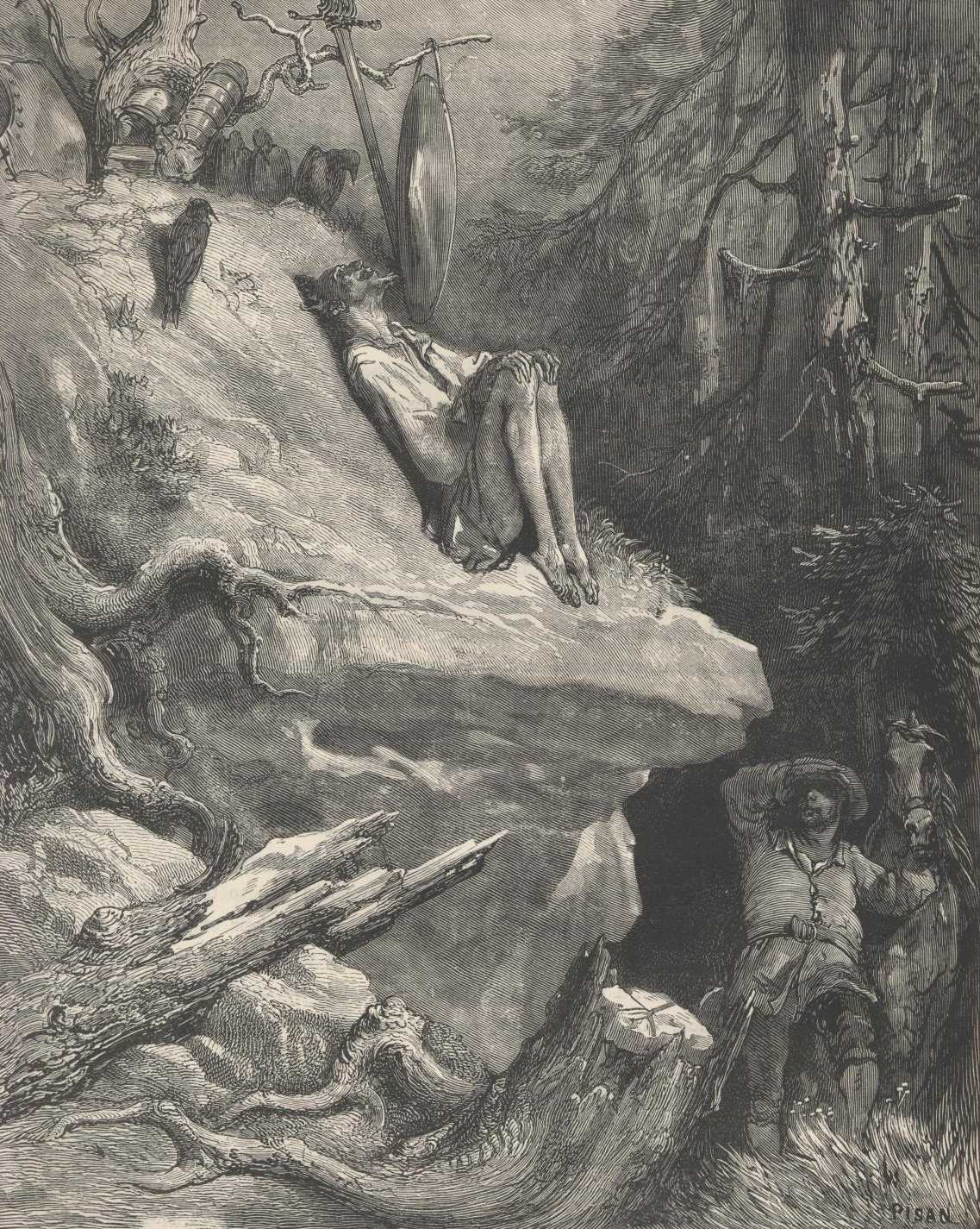 “I draw my stakes,” said Sancho, “and will retreat with this pasty to the brook there, where I mean to victual myself for three days; for I have heard my lord, Don Quixote, say that a knight-errant’s squire should eat until he can hold no more, whenever he has the chance, because it often happens them to get by accident into a wood so thick that they cannot find a way out of it for six days; and if the man is not well filled or his alforjas well stored, there he may stay, as very often he does, turned into a dried mummy.”