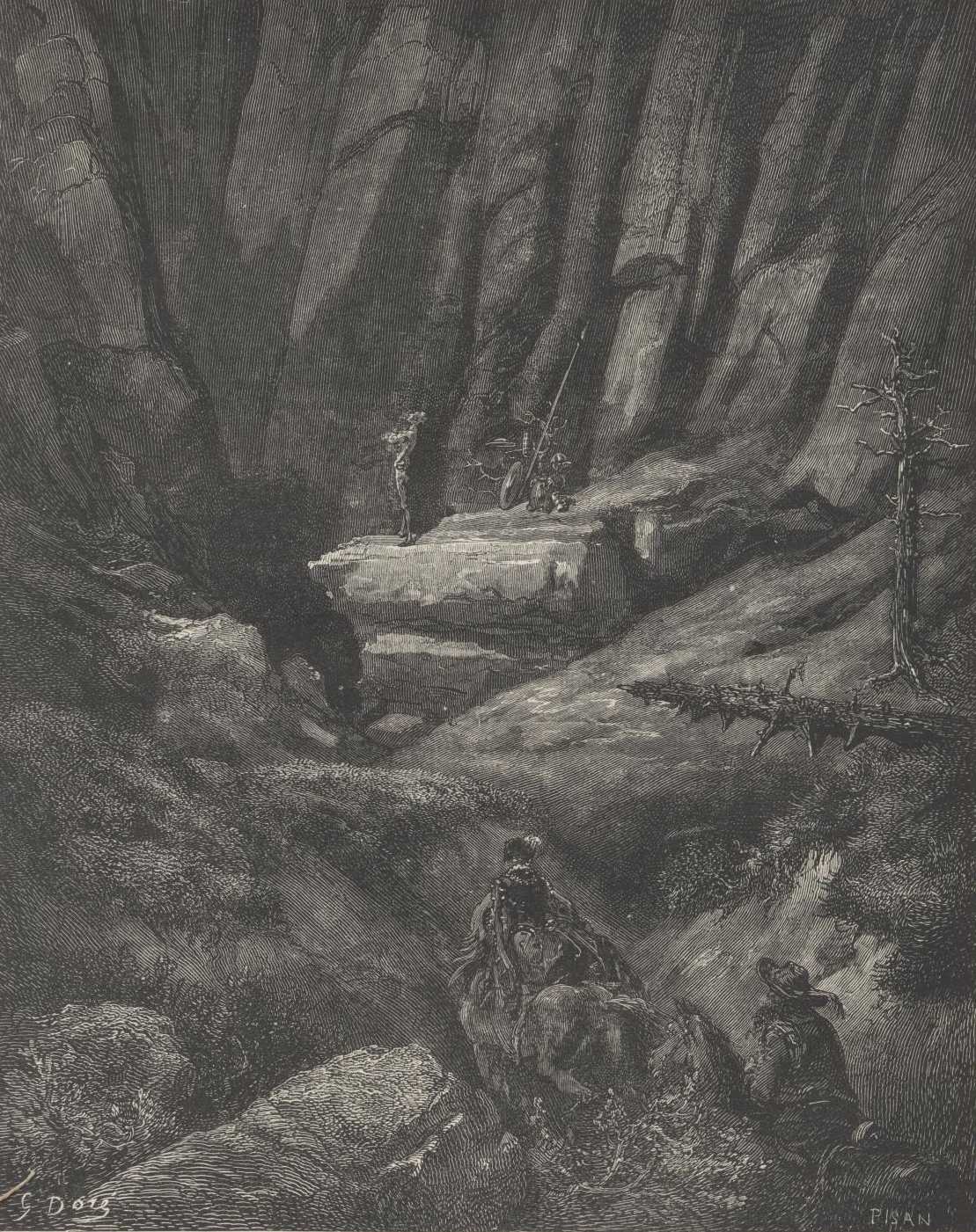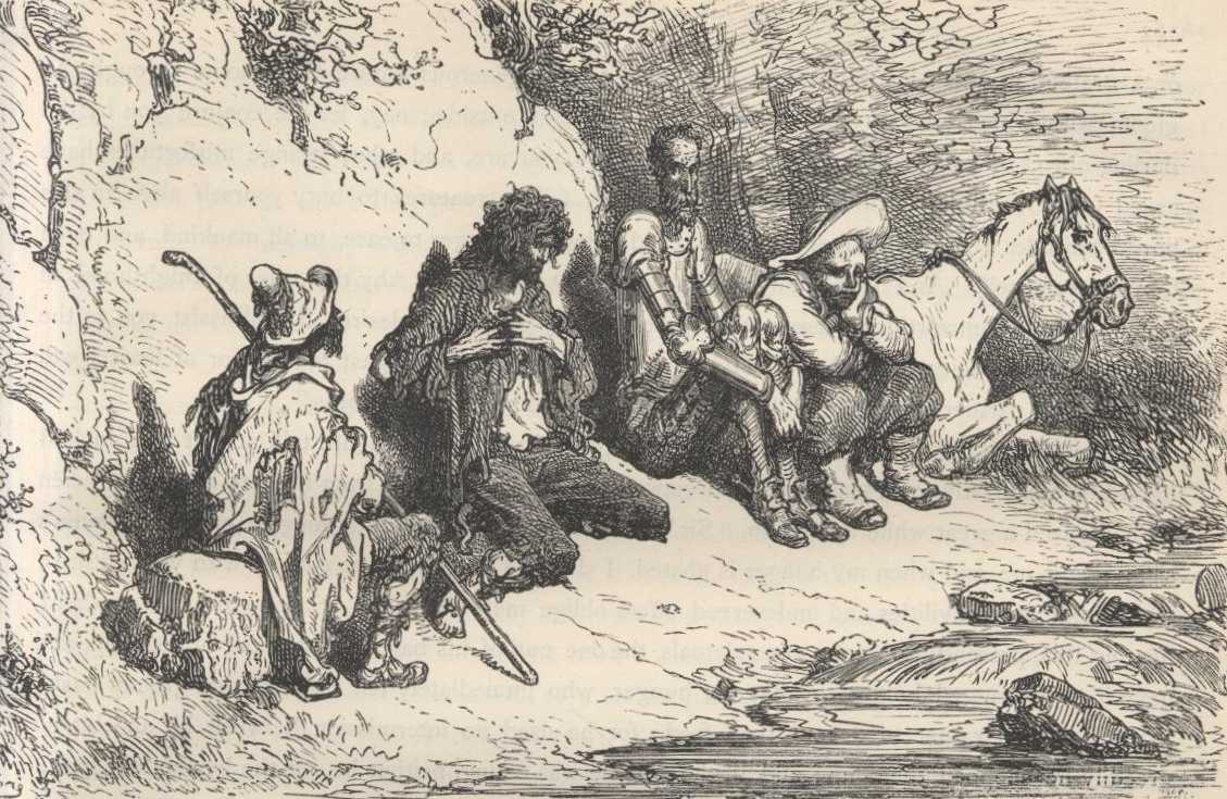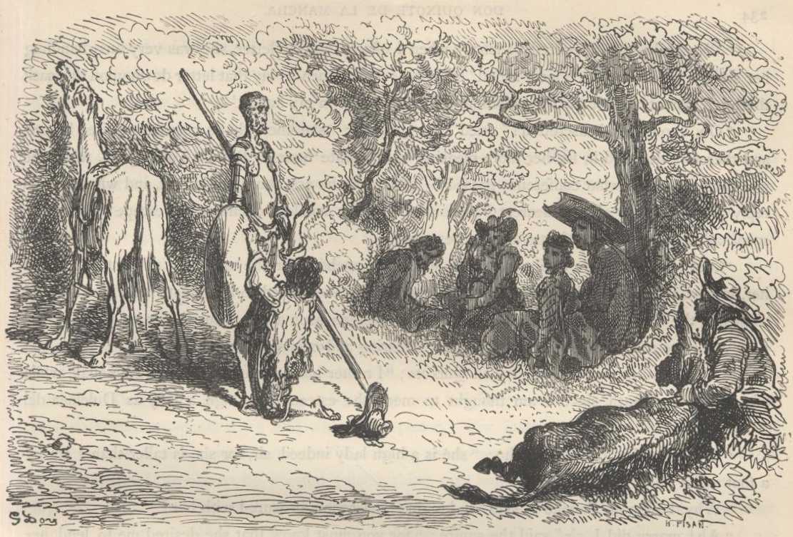 By this time the canon’s servants, who had gone to the inn to fetch the sumpter mule, had returned, and making a carpet and the green grass of the meadow serve as a table, they seated themselves in the shade of some trees and made their repast there, that the carter might not be deprived of the advantage of the spot, as has been already said. As they were eating they suddenly heard a loud noise and the sound of a bell that seemed to come from among some brambles and thick bushes that were close by, and the same instant they observed a beautiful goat, spotted all over black, white, and brown, spring out of the thicket with a goatherd after it, calling to it and uttering the usual cries to make it stop or turn back to the fold. The fugitive goat, scared and frightened, ran towards the company as if seeking their protection and then stood still, and the goatherd coming up seized it by the horns and began to talk to it as if it were possessed of reason and understanding: “Ah wanderer, wanderer, Spotty, Spotty; how have you gone limping all this time? What wolves have frightened you, my daughter? Won’t you tell me what is the matter, my beauty? But what else can it be except that you are a she, and cannot keep quiet? A plague on your humours and the humours of those you take after! Come back, come back, my darling; and if you will not be so happy, at any rate you will be safe in the fold or with your companions; for if you who ought to keep and lead them, go wandering astray, what will become of them?”