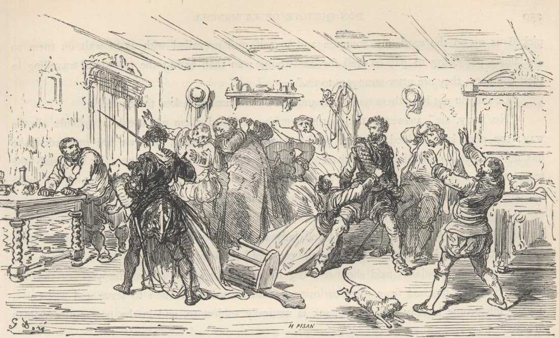 “You are a great scoundrel,” said Don Quixote, “and it is you who are empty and a fool. I am fuller than ever was the whoreson bitch that bore you;” and passing from words to deeds, he caught up a loaf that was near him and sent it full in the goatherd’s face, with such force that he flattened his nose; but the goatherd, who did not understand jokes, and found himself roughly handled in such good earnest, paying no respect to carpet, tablecloth, or diners, sprang upon Don Quixote, and seizing him by the throat with both hands would no doubt have throttled him, had not Sancho Panza that instant come to the rescue, and grasping him by the shoulders flung him down on the table, smashing plates, breaking glasses, and upsetting and scattering everything on it. Don Quixote, finding himself free, strove to get on top of the goatherd, who, with his face covered with blood, and soundly kicked by Sancho, was on all fours feeling about for one of the table-knives to take a bloody revenge with. The canon and the curate, however, prevented him, but the barber so contrived it that he got Don Quixote under him, and rained down upon him such a shower of fisticuffs that the poor knight’s face streamed with blood as freely as his own. The canon and the curate were bursting with laughter, the officers were capering with delight, and both the one and the other hissed them on as they do dogs that are worrying one another in a fight. Sancho alone was frantic, for he could not free himself from the grasp of one of the canon’s servants, who kept him from going to his master’s assistance.