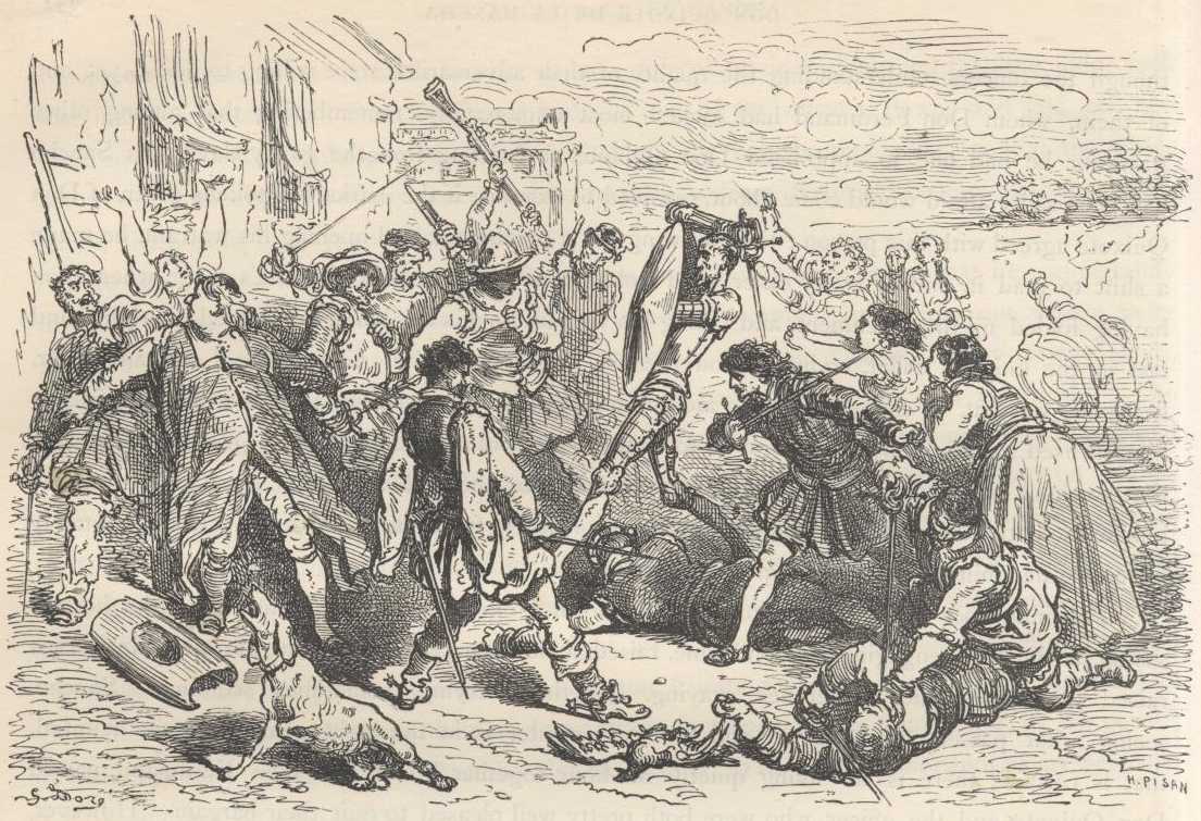 From these words all the hearers concluded that he must be a madman, and began to laugh heartily, and their laughter acted like gunpowder on Don Quixote’s fury, for drawing his sword without another word he made a rush at the stand. One of those who supported it, leaving the burden to his comrades, advanced to meet him, flourishing a forked stick that he had for propping up the stand when resting, and with this he caught a mighty cut Don Quixote made at him that severed it in two; but with the portion that remained in his hand he dealt such a thwack on the shoulder of Don Quixote’s sword arm (which the buckler could not protect against the clownish assault) that poor Don Quixote came to the ground in a sad plight.