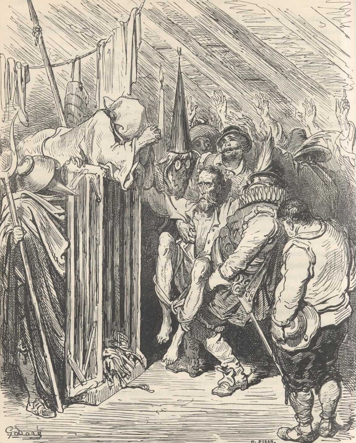While this was going on, Sancho, perceiving that he could speak to his master without having the curate and the barber, of whom he had his suspicions, present all the time, approached the cage in which Don Quixote was placed, and said, “Señor, to ease my conscience I want to tell you the state of the case as to your enchantment, and that is that these two here, with their faces covered, are the curate of our village and the barber; and I suspect they have hit upon this plan of carrying you off in this fashion, out of pure envy because your worship surpasses them in doing famous deeds; and if this be the truth it follows that you are not enchanted, but hoodwinked and made a fool of. And to prove this I want to ask you one thing; and if you answer me as I believe you will answer, you will be able to lay your finger on the trick, and you will see that you are not enchanted but gone wrong in your wits.”
