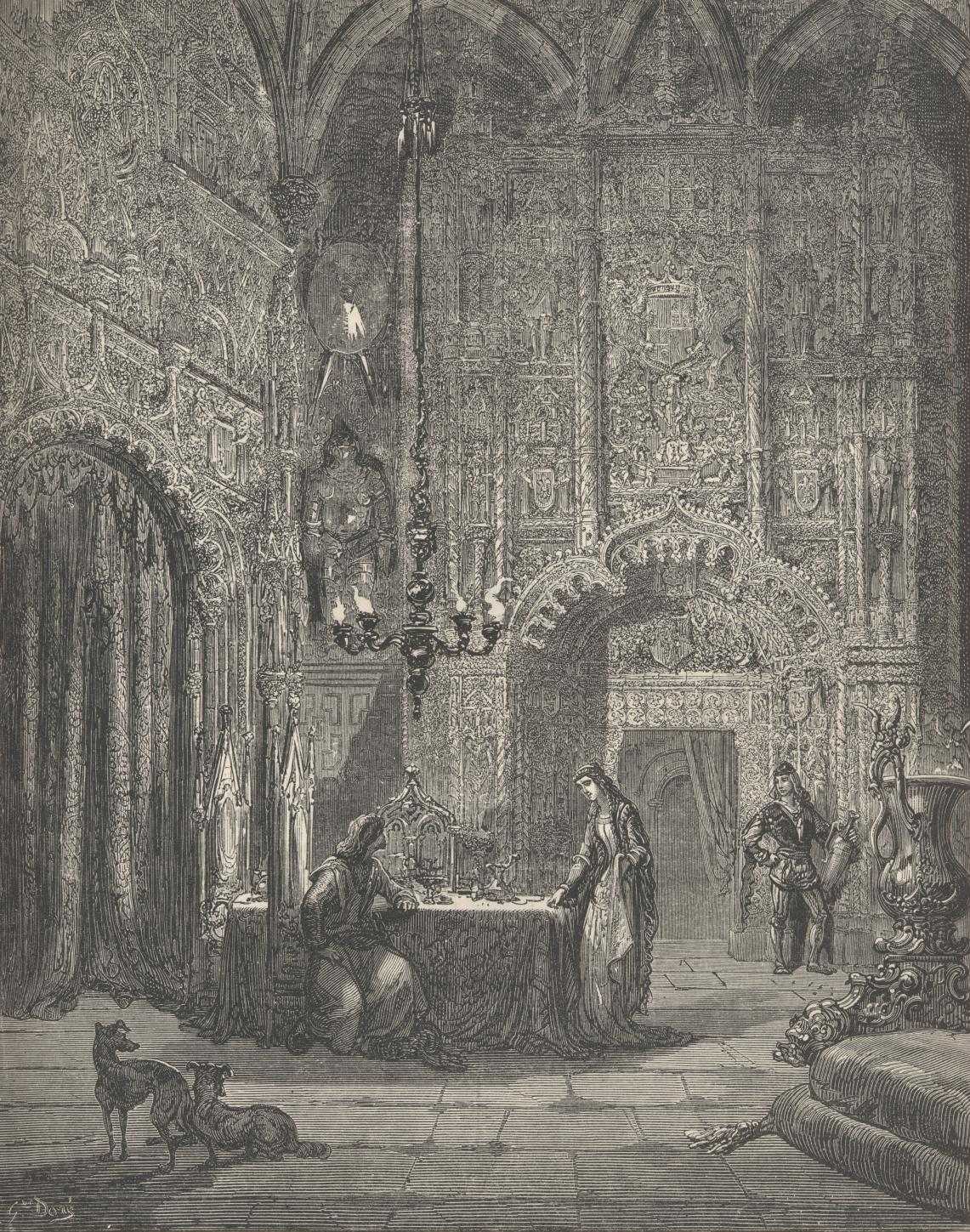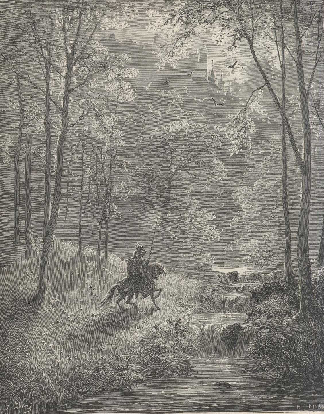 “Suddenly there is presented to his sight a strong castle or gorgeous palace with walls of massy gold, turrets of diamond and gates of jacinth; in short, so marvellous is its structure that though the materials of which it is built are nothing less than diamonds, carbuncles, rubies, pearls, gold, and emeralds, the workmanship is still more rare. And after having seen all this, what can be more charming than to see how a bevy of damsels comes forth from the gate of the castle in gay and gorgeous attire, such that, were I to set myself now to depict it as the histories describe it to us, I should never have done; and then how she who seems to be the first among them all takes the bold knight who plunged into the boiling lake by the hand, and without addressing a word to him leads him into the rich palace or castle, and strips him as naked as when his mother bore him, and bathes him in lukewarm water, and anoints him all over with sweet-smelling unguents, and clothes him in a shirt of the softest sendal, all scented and perfumed, while another damsel comes and throws over his shoulders a mantle which is said to be worth at the very least a city, and even more? How charming it is, then, when they tell us how, after all this, they lead him to another chamber where he finds the tables set out in such style that he is filled with amazement and wonder; to see how they pour out water for his hands distilled from amber and sweet-scented flowers; how they seat him on an ivory chair; to see how the damsels wait on him all in profound silence; how they bring him such a variety of dainties so temptingly prepared that the appetite is at a loss which to select; to hear the music that resounds while he is at table, by whom or whence produced he knows not. And then when the repast is over and the tables removed, for the knight to recline in the chair, picking his teeth perhaps as usual, and a damsel, much lovelier than any of the others, to enter unexpectedly by the chamber door, and herself by his side, and begin to tell him what the castle is, and how she is held enchanted there, and other things that amaze the knight and astonish the readers who are perusing his history.