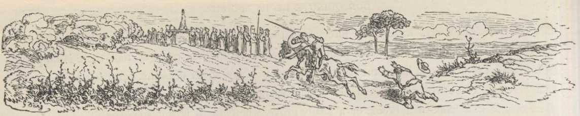 The fact was that the clouds had that year withheld their moisture from the earth, and in all the villages of the district they were organising processions, rogations, and penances, imploring God to open the hands of his mercy and send the rain; and to this end the people of a village that was hard by were going in procession to a holy hermitage there was on one side of that valley. Don Quixote when he saw the strange garb of the penitents, without reflecting how often he had seen it before, took it into his head that this was a case of adventure, and that it fell to him alone as a knight-errant to engage in it; and he was all the more confirmed in this notion, by the idea that an image draped in black they had with them was some illustrious lady that these villains and discourteous thieves were carrying off by force. As soon as this occurred to him he ran with all speed to Rocinante who was grazing at large, and taking the bridle and the buckler from the saddle-bow, he had him bridled in an instant, and calling to Sancho for his sword he mounted Rocinante, braced his buckler on his arm, and in a loud voice exclaimed to those who stood by, “Now, noble company, ye shall see how important it is that there should be knights in the world professing the order of knight-errantry; now, I say, ye shall see, by the deliverance of that worthy lady who is borne captive there, whether knights-errant deserve to be held in estimation,” and so saying he brought his legs to bear on Rocinante—for he had no spurs—and at a full canter (for in all this veracious history we never read of Rocinante fairly galloping) set off to encounter the penitents, though the curate, the canon, and the barber ran to prevent him. But it was out of their power, nor did he even stop for the shouts of Sancho calling after him, “Where are you going, Señor Don Quixote? What devils have possessed you to set you on against our Catholic faith? Plague take me! mind, that is a procession of penitents, and the lady they are carrying on that stand there is the blessed image of the immaculate Virgin. Take care what you are doing, señor, for this time it may be safely said you don’t know what you are about.” Sancho laboured in vain, for his master was so bent on coming to quarters with these sheeted figures and releasing the lady in black that he did not hear a word; and even had he heard, he would not have turned back if the king had ordered him. He came up with the procession and reined in Rocinante, who was already anxious enough to slacken speed a little, and in a hoarse, excited voice he exclaimed, “You who hide your faces, perhaps because you are not good subjects, pay attention and listen to what I am about to say to you.” The first to halt were those who were carrying the image, and one of the four ecclesiastics who were chanting the Litany, struck by the strange figure of Don Quixote, the leanness of Rocinante, and the other ludicrous peculiarities he observed, said in reply to him, “Brother, if you have anything to say to us say it quickly, for these brethren are whipping themselves, and we cannot stop, nor is it reasonable we should stop to hear anything, unless indeed it is short enough to be said in two words.”