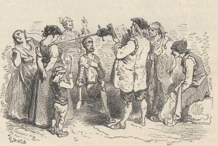 About this time there arrived in our town one Vicente de la Roca, the son of a poor peasant of the same town, the said Vicente having returned from service as a soldier in Italy and divers other parts. A captain who chanced to pass that way with his company had carried him off from our village when he was a boy of about twelve years, and now twelve years later the young man came back in a soldier’s uniform, arrayed in a thousand colours, and all over glass trinkets and fine steel chains. To-day he would appear in one gay dress, to-morrow in another; but all flimsy and gaudy, of little substance and less worth. The peasant folk, who are naturally malicious, and when they have nothing to do can be malice itself, remarked all this, and took note of his finery and jewellery, piece by piece, and discovered that he had three suits of different colours, with garters and stockings to match; but he made so many arrangements and combinations out of them, that if they had not counted them, anyone would have sworn that he had made a display of more than ten suits of clothes and twenty plumes. Do not look upon all this that I am telling you about the clothes as uncalled for or spun out, for they have a great deal to do with the story. He used to seat himself on a bench under the great poplar in our plaza, and there he would keep us all hanging open-mouthed on the stories he told us of his exploits. There was no country on the face of the globe he had not seen, nor battle he had not been engaged in; he had killed more Moors than there are in Morocco and Tunis, and fought more single combats, according to his own account, than Garcilaso, Diego Garcia de Paredes and a thousand others he named, and out of all he had come victorious without losing a drop of blood. On the other hand he showed marks of wounds, which, though they could not be made out, he said were gunshot wounds received in divers encounters and actions. Lastly, with monstrous impudence he used to say “you” to his equals and even those who knew what he was, and declare that his arm was his father and his deeds his pedigree, and that being a soldier he was as good as the king himself. And to add to these swaggering ways he was a trifle of a musician, and played the guitar with such a flourish that some said he made it speak; nor did his accomplishments end here, for he was something of a poet too, and on every trifle that happened in the town he made a ballad a league long.