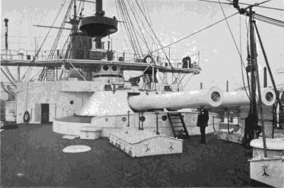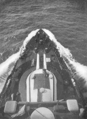 Looking down, on board a battleship, from the forward fighting-top.