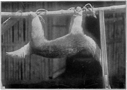 While homeward bound we crossed a small open place where not a plant grew, and the sand shimmered with a dull glow. Coming directly for us was a white, plume-like, waving object which could hardly be distinguished from its surroundings, but when both the judge and the secretario shouted Zorino I knew enough to shoot, and shoot to kill. We waited a moment to see whether the animal was dead, then approaching carefully, I picked up a fine skunk. Just then his mate put in an appearance on the edge of the opening, and there was no choice but to add her to the collection. When it came to carrying home these additions to the bag, even the Indian balked, so I tied them to the end of my gun-barrel and carried them in this manner. Early the next morning the entire town came to see the Zorinos; the scent had penetrated into the furthermost hut, and they had unerringly traced it to its source.