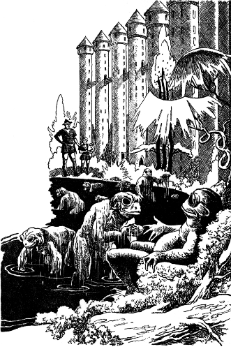 "We were just blasting off for Earth," he said, "but I heard you and Pa talking. If you want to go in the swamp, I'll show you the way. I've been there lots. The Ophirians hang out on the shores of the black lake, where the organ pipes are." He pointed to the towering pinnacles in the distance. "They catch shellfish there."
