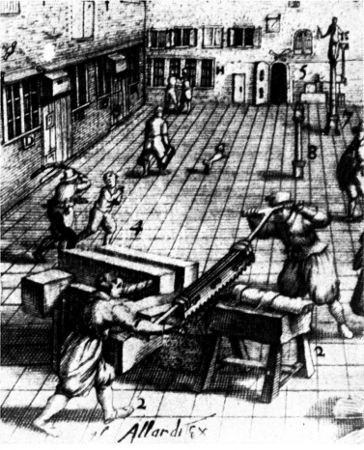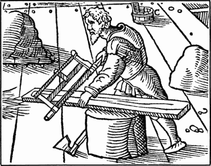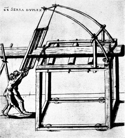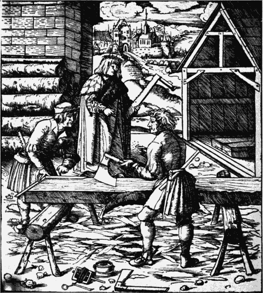 Die Werkzeuge des Zimmermanns, darunter auch 2 Sägen, sind sehr deutlich auf einem Holzschnitt dargestellt (Seite 39), der im Jahre 1546 in einem Buch über die Perspektive erschien.[47]