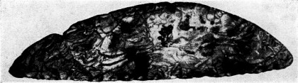 Wie die Säge in der älteren Steinzeit aussah, erkennen wir an einem (s. Abb.) schönen, handgroßen Stück einer bei Flensburg gefundenen Säge aus Feuerstein, die sich im »Museum für Völkerkunde« in Berlin befindet.[S. 7] Es ist deutlich zu erkennen, daß die schwach gebogene Kante dieses Stücks absichtlich gezähnt ist.[1]