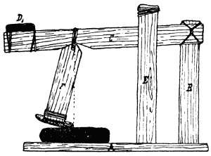 Wir haben aus der jüngeren Steinzeit, als man die steinernen Waffen und Werkzeuge an ihren Oberflächen sorgsam schliff, wiederholt Steinbrocken gefunden, die eigentümliche Sägeschnitte aufweisen. Sägt man mit einer steinernen oder hölzernen Säge, dann wird der Schnitt am Anfang und am Ende gewöhnlich tiefer in das Material hineingehen, als in der Mitte des Werkstückes. Der Schnitt wird um so mehr konvex verlaufen, je ungeübter oder sorgloser die menschliche Hand arbeitet. Bei den aufgefundenen Steinbrocken verläuft der Schnitt aber konkav, d. h. er hat in der Mitte des Werkstücks seine tiefste Stelle. Das läßt sich erklären, wenn man eine besondere Sägemaschine annimmt. An der gleichen Fundstelle sind die in den Steinen liegenden Bogen stets die gleichen. Mithin ging die Säge in einer Führung mit gleichbleibendem Radius (s. Abb.). Der Straßburger Archäologe Robert Forrer hat an Hand solcher Steinfunde eine Sägemaschine rekonstruiert, wie sie rund ums Jahr 3500 vor unserer Zeitrechnung benutzt wurde. Sie entspricht im Aufbau einer gleichzeitigen Steinbohrmaschine.[3] Wir erkennen auf einem Grundbrett A eine Säule B, sie trägt auf einem Holzzapfen oben[S. 9] in einer Bindung einen wagerecht liegenden Hebel C. Damit dieser Hebel nicht seitlich ausweichen kann, wird er von zwei Balken E, die oben durch Bindung im nötigen Abstand gehalten werden, geführt. Auf den Hebel ist ein Stein D gebunden, um beim Sägen einen gleichmäßigen Druck zu geben. Der schon erwähnte Sägearm F trägt unten in einem Schlitz die steinerne oder hölzerne Säge. Wird sie über den darunterliegenden Werkstein hinweggeführt, dann entsteht — bei hölzernen Sägen unter Hinzugabe von Sand — der Sägeschnitt. Selten wird man diesen Schnitt tief in den Stein hineingeführt haben. Dann drehte man den Stein um und sägte von der anderen Seite einen gleichen Schnitt, so daß man den Stein zwischen den beiden Schnitten zerschlagen konnte.[4]