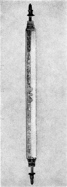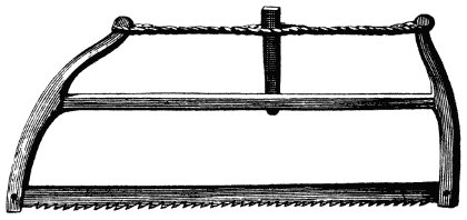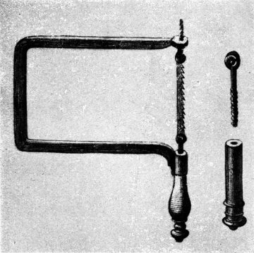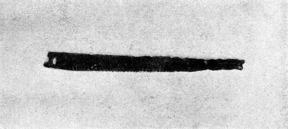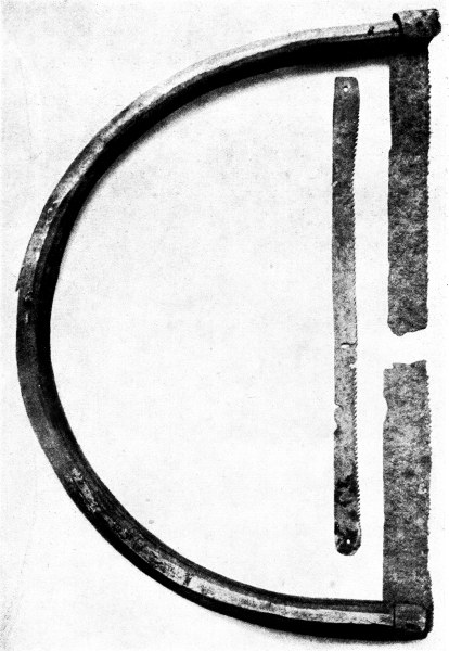 Die Bronzesäge ging auch in den griechischen Kulturkreis über. Auf Seite 12 ist eine feine, bronzene Knochensäge mit angegossenem Griff abgebildet, wie sie ums Jahr 200 v. Chr. von griechischen Ärzten bei[S. 12] Amputationen benutzt wurde. Die ganze Länge dieses zu Ephesos gefundenen Stückes mißt 205 mm[9].