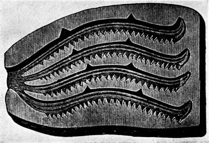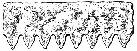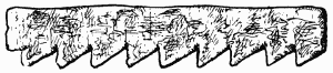 [S. 19] In den Pfahlbauten zu Wollishofen am Züricher See fand man ein Stück von einem Sägeblatt, das hinter einer Reihe von Zähnen eine eigenartige Strichteilung enthält. Es scheint so, als ob der Handwerker sich ehemals diese Teilung zuerst gemacht habe, um danach die Zähne in gleichen Abständen einfeilen zu können. Die Wiedergabe der Photographie (siehe unten) ist leider nicht so deutlich wie das Originalstück, das sich im römisch-germanischen Zentralmuseum in Mainz befindet.[21]