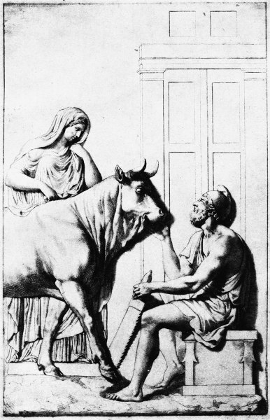 Daedalos wird im Altertum mit einer Säge in der Hand abgebildet (Seite 13). Hier sehen wir ihn mit diesem Werkzeug vor der von ihm angefertigten hölzernen Kuh, die er für die Gattin des Königs Minos lebenswahr gebildet hatte[11].