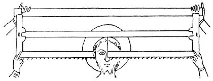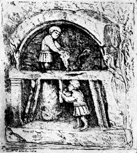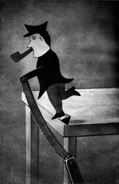 Im Jahre 1883 fand man in Deneuvre (Departement Meurthe-et-Moselle) einen Stein mit dem hier neben wiedergegebenen Relief. Da man gleichzeitig eine Münze[S. 17] des römischen Kaisers Constantinus fand, kann man diese Darstellung auf etwa 325 nach Chr. datieren. Wir sehen in einer Nische die Darstellung eines auf gespreizten Beinen stehenden Sägebockes. Auf ihm liegt — was an dem arg beschädigten Stein nicht mehr sichtbar ist — das zu sägende Bord. Ein Säger steht auf dem Bock, der andere darunter. Die Säge ist so stark beschädigt, daß sie nicht mehr in den Einzelheiten zu erkennen ist. Ja, das über dem Bord herausragende Stück der Säge verläuft wesentlich anders, als das unten sichtbare[16].