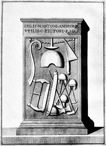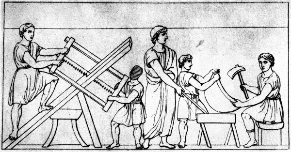 Im Museum zu Volterra in Italien befindet sich eine römische Alabastervase (Seite 14), auf der man sieht, wie zwei Männer einen aufrechtstehenden Balken zersägen[13]. Und das gleiche Museum besitzt eine Vase aus Tuffstein, auf der die Handhabung einer römischen Rahmensäge klarer zu sehen ist (Seite 16)[14].