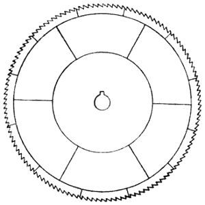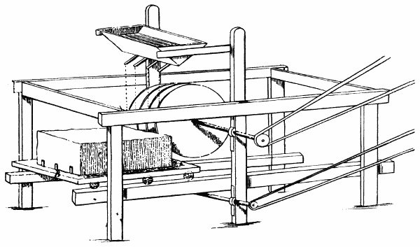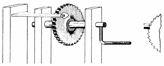 Um's Jahr 1550 überreichte der Nürnberger Mechaniker Hanns Lobsinger den Stadtvätern ein handschriftliches Verzeichnis seiner mechanischen Erfindungen. Es ist nicht veröffentlicht worden und neuerdings auch im Original verschwunden. Aus einem älteren Auszug wissen wir aber, daß Lobsinger eine ganze Reihe bedeutsamer Erfindungen machte und[S. 38] daß einige von ihnen der Zeit um Jahrhunderte vorauseilten. So fertigte er auch Maschinen, »in welchen ein Rad den Marmor oder andere Steine, welche man sonsten mit einer kupffern Sägen sehr langsam durcharbeitete, ziemlich förderlich durchschneiden muste«[48]. Demnach verwendete Lobsinger schon vor 350 Jahren in Nürnberg die ungezahnte Kreissäge zum Steinschneiden. Diese Erfindung ist um so erstaunlicher, als doch unsere heutige[S. 39] Kreissäge für Steine (Seite 62) erst im Jahre 1833 in England erfunden wurde[49]. Sonderbar nur, daß Lobsinger nicht auf den Gedanken kam, die Scheibe zu zahnen, um Holz damit zu schneiden. Die Kreissäge für Holz wurde, wie wir noch hören, erst 1793 erfunden.