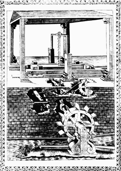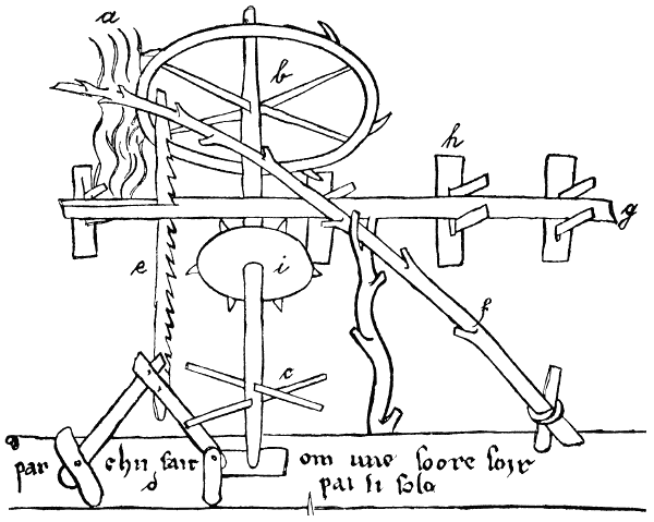 Ein selbsttätig arbeitendes Sägewerk mit Wasserkraft wird von dem um 1245 wirkenden französischen Ingenieur Wilars entworfen (unten). Bei der Skizze steht nur vermerkt: »Auf diese Art macht man eine Säge, um selbsttätig zu sägen.« Um die Skizze besser verständlich zu machen,[S. 25] habe ich Buchstaben eingefügt: a stellt den Bach dar, der das unterschlägige Wasserrad b treibt, auf dessen Wellbaum die vier Daumen c sitzen. Diese drücken die Hebel d und mit ihnen die Säge e nieder, die durch den federnden Baum f wieder hochgezogen wird, g ist der in den Führungen h gleitende Balken, den das Zackenrad i gegen die Säge vorschiebt.