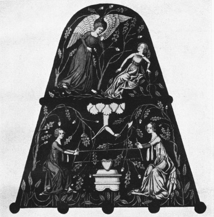 Eine prächtige Stickerei in Seide und Gold (Seite 25), die aus dem Besitz der Grafen von Champagne stammt, wird im Schatz der Kathedrale zu Troyes aufbewahrt[30]. Die Kleidung der Figuren läßt darauf schließen, daß dieses Stück, das wohl ein Geldbeutel oder Klingelbeutel gewesen ist, aus der Zeit von 1350–1400 stammt. Zwei Frauen sägen mit einer Rahmensäge ein menschliches Herz. Es soll sinnbildlich dargestellt werden, daß die Frauen den Männerherzen blutige Schmerzen bereiten. Rettend kommt aus einem Wolkengebilde eine Hand mit einem Beil, um die Säge zu zerschlagen. Vom Himmel her kommt also den irdischen Liebesschmerzen die einzige Rettung.
