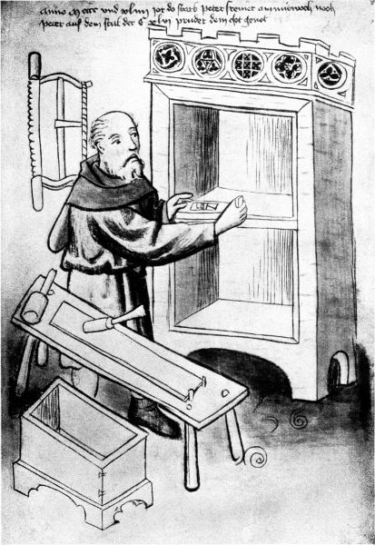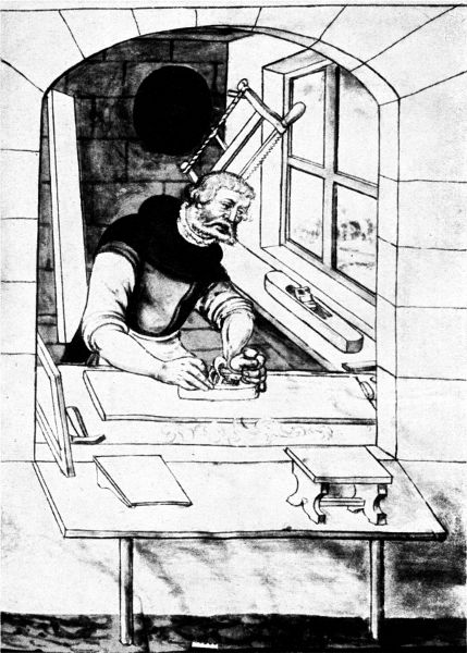 Ums Jahr 1398 wurde im Mendelschen Stiftungsbuch der 47. Bruder der Stiftung, Karl Schreyner, porträtiert (Seite 27). Wir sehen ihn an einer der damals gebräuchlichen sehr einfachen Hobelbänke bei der Arbeit. Die Bank hat noch keine Schraubklemmen, sondern nur Löcher zum Einschlagen hölzerner Bankpflöcke. Im Vordergrund steht eine Truhe[S. 28] und daneben ein kleiner Schrank. An der Wand der Werkstätte hängt eine schön geschweifte Rahmensäge.