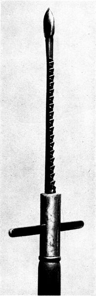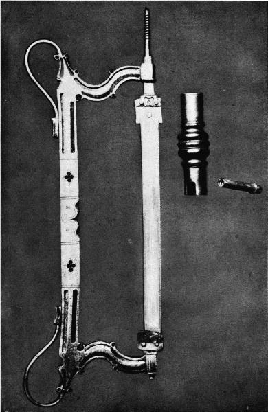 Im Germanischen National-Museum zu Nürnberg wird ein Kriegswerkzeug aufbewahrt, das man »Bohr-Säge« nennen könnte (Seite 31). Es besteht aus einem starken hölzernen Stiel von 120 cm Länge, der an einem Ende mit einer kräftigen Eisentülle versehen ist. Aus dieser Tülle läßt sich ein vierkantiges Werkzeug herausziehen und durch ein eingeschobenes Eisen feststellen. Oben trägt das Werkzeug einen Bohrer und darunter eine kräftige Säge. Man näherte sich mit diesem Stück einem feindlichen Tor, bohrte dieses an und sägte dann schnell das Schloß oder die Schloßnieten heraus. Die ausgezogene Säge hat eine Länge von 28 cm. Diese Bohrsäge stammt aus dem Dresdner Zeughaus und ist, wenn man eine Datierung versuchen soll, wohl ums Jahr 1640 entstanden[34].
