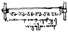 Mögen die Sägezähne auf Zug oder Stoß gestellt sein, immer bedingen sie Verlust an Zeit, weil man die Säge der Zahnstellung entgegen wieder zurückbringen muß. Es war deshalb eine bedeutsame Erfindung, die Sägezähne so anzuordnen, daß sie sowohl beim Zug als auch beim Stoß wirkten. Man[S. 35] könnte glauben, diese Erfindung sei eine absichtliche Vereinigung unserer stoßenden Säge mit der ziehenden Säge der Orientalen. Solche Schlüsse aber darf man in der Geschichte der Erfindungen nicht machen. Aus Abbildungen des Altertums und des Mittelalters und aus den wenigen gefundenen Stücken ist nicht zu ersehen, welche Gestaltung die Zähne hatten. Man kann nur annehmen, daß die Formgebung bei jedem Meister, der Sägen machte, eine willkürliche war. Der erste, von dem wir mit Sicherheit wissen, daß er M-förmige Zähne bewußt verwandte, war Leonardo da Vinci, der vielseitige italienische Künstler und Generalingenieur[39]. Aus den tausenden Skizzen, die Leonardo aus seiner technischen Praxis, wie auch[S. 36] als Erfinder hinterlassen hat, besitzen wir in einem kleinen, zu Paris aufbewahrten Notizbuch die hier (Seite 35) wiedergegebene Skizze, unter der die Worte stehen: »Doppelte Säge, die ziehend und stoßend operiert.« Dieses Notizheft Leonardos stammt aus den Jahren 1488–1497[40].