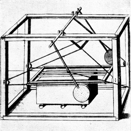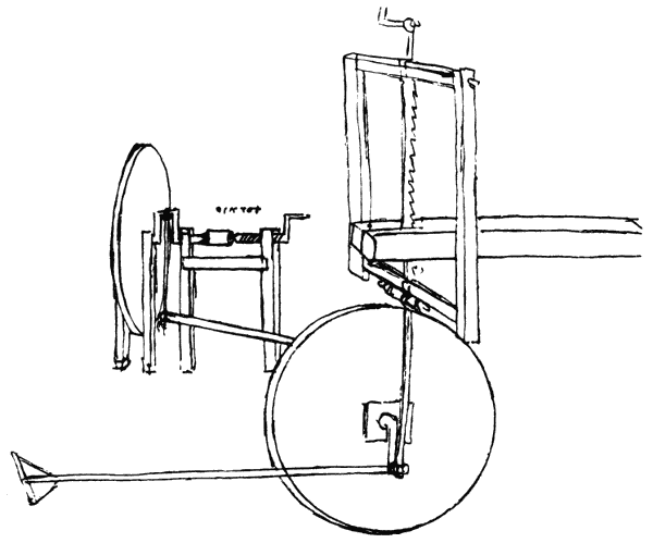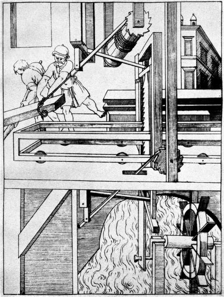 Leonardo da Vinci beschäftigte sich auch mit der Konstruktion von Sägewerken. Den Antrieb zu einem solchen skizziert er dicht neben dem frühsten bekannten Entwurf zu einer Drehbank mit Tretvorrichtung (Seite 35). Die Drehbank stößt mit dem Spindelstock-Balken und dem Fußtritt an das Schwungrad des Sägewerks, es ist also nicht schwer, die Zeichnungen der beiden Maschinen auseinander zu halten. Die Säge sitzt in einem Rahmen und wird oben und unten von je einer Kurbel gefaßt. Unten trägt die Kurbelachse eine Schwungscheibe, und wir müssen annehmen, daß die beiden Kurbelachsen irgendwie zwangsläufig verbunden waren. Der Antrieb der unteren Kurbel erfolgt mittelst einer am Ausgang des Mittelalters gebräuchlichen Hand-Schubstange.