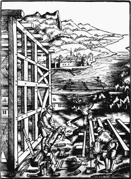 Am Ufer sehen wir werktätiges Leben: es wird alles hergerichtet, was zum Bau notwendig ist. Im Hintergrund, am Wald, werden die gefällten[S. 31] Bäume von Zimmerleuten zugerichtet und im Vordergrund zu Konstruktionen zusammengesetzt.