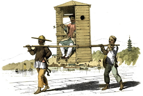 Whenever the Emperor of China goes in state to transact public business, to receive ambassadors, or to hold a court, he is carried in the same kind of a sedan chair as are commonly used in Europe, and which, as well as umbrellas, have obviously been first introduced from China. The soft luxury of an Indian palanquin is unknown to the Chinese. By means of poles attached to each other the Emperor’s chair, on grand occasions, is carried by eight pair of bearers, sometimes by four pair, but on ordinary occasions he has no more than two pair. They are generally the stoutest and tallest men that can be found, and are dressed in a long yellow vest, which is the colour assumed by the imperial family.