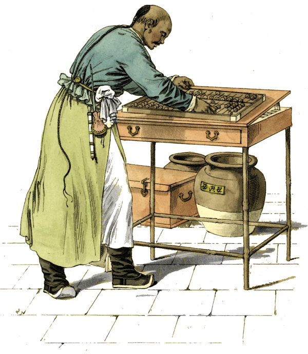 The Chinese merchants and tradesmen are most expert and ready reckoners; but they perform all arithmetical operations mechanically, by means of a table divided into two compartments, through which pass iron wires; and on these wires are strung in one compartment five, and in the other two, moveable balls. The principle is something of the same kind as that of the abacus of the Romans, and is with some little variation still made use of in Russia. It has been observed, that in weighing several thousand chests of tea, or bales of goods, at Canton, the Chinese accountant can invariably name the sum total long before the European can cast up his account.