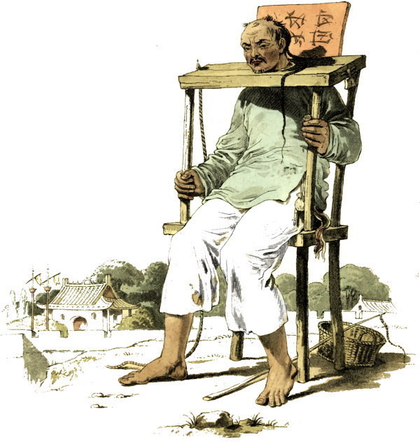 The punishment of the cangue may be compared to that of our pillory, with this difference, that in China a person convicted of petty crimes or misdemeanours is sometimes sentenced to carry the wooden clog about his neck for weeks, or even months; sometimes one hand, or even both hands, are inserted through holes, as well as the neck. The annexed representation is not a common one, and far less painful than the plain heavy tablet of wood, the whole weight of which must be supported on the shoulders; whereas in this it is mere confinement, without the person being compelled to carry a heavy load. The nature of the offence is always described in large characters, either on the edge of the cangue, or, as in the present instance, on a piece of board attached to it.