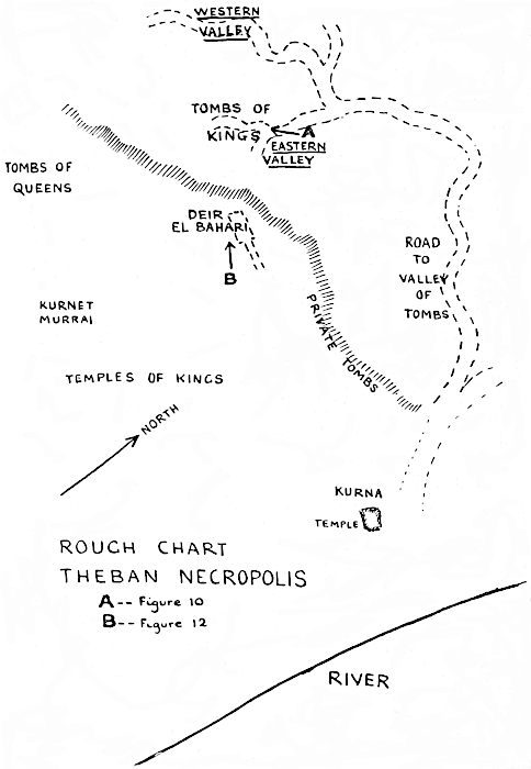 The work of modern exploration of the Valley of the Tombs of the Kings can be said to have begun in 1819 when the traveller Belzoni opened and wrote a description of the tomb of Seti I. In 1881 the discovery was made of a collection of royal mummies, many of which had been buried about thirty centuries ago in the Valley of the Tombs, and had been removed about 1000 b.c. and hidden in a chamber in the great cliff (behind Deir el Bahari) that faces the Nile across the Theban plain. This stimulated renewed interest in the famous necropolis, but it was not until 1898 that the work of exploration there was rewarded by the discovery of the tomb of Amenhotep II containing the mummy of that pharaoh himself—the only king’s mummy ever found in his own tomb before the discovery of Tutankhamen’s, in which it is confidently 25 believed the mummy is present and undisturbed, an unprecedented circumstance which will make the investigations next winter peculiarly important. For the mummy of Amenhotep II had been badly plundered like all those discovered before or since until the opening of Tutankhamen’s burial chamber made it practically certain that in it will be revealed for the first time to modern men the undisturbed tomb of an ancient Egyptian king.